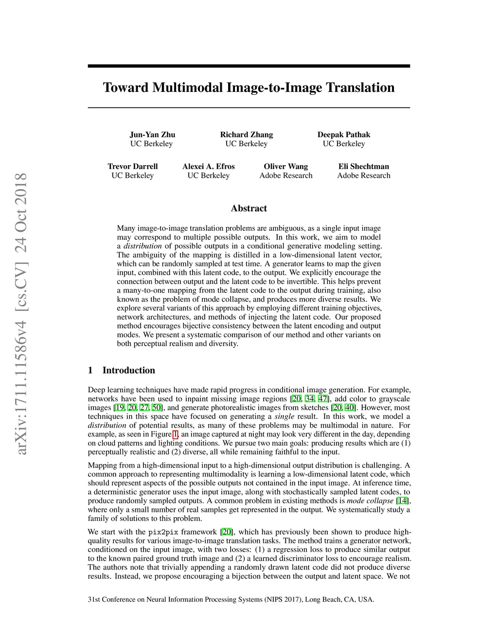 Many image-to-image translation problems are ambiguous, as a single input image may correspond to multiple possible outputs. In this work, we aim to model a \emph{distribution} of possible outputs in a conditional generative modeling setting. The ambiguity of the mapping is distilled in a low-dimensional latent vector, which can be randomly sampled at test time. A generator learns to map the given input, combined with this latent code, to the output. We explicitly encourage the connection between output and the latent code to be invertible. This helps prevent a many-to-one mapping from the latent code to the output during training, also known as the problem of mode collapse, and produces more diverse results. We explore several variants of this approach by employing different training objectives, network architectures, and methods of injecting the latent code. Our proposed method encourages bijective consistency between the latent encoding and output modes. We present a systematic comparison of our method and other variants on both perceptual realism and diversity.