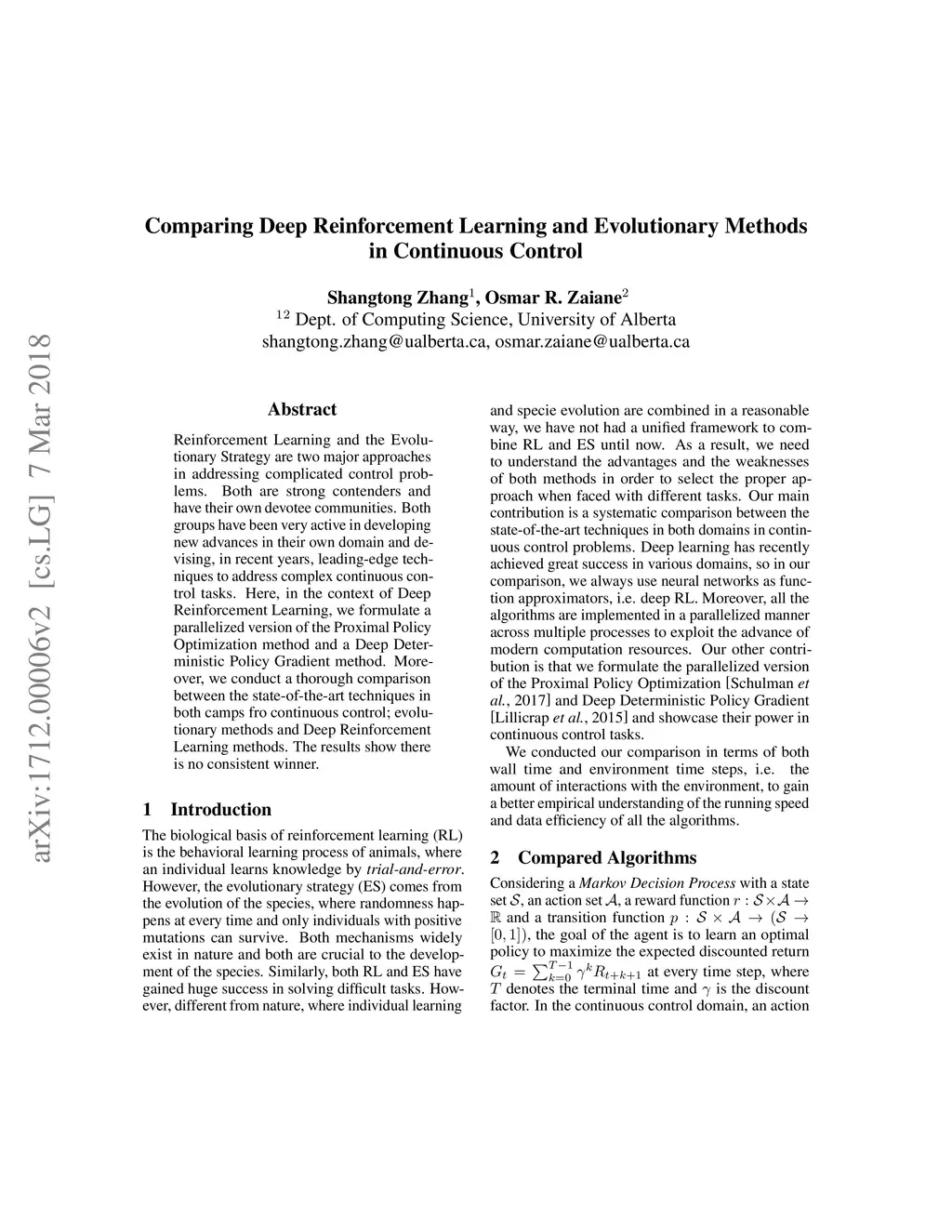 Reinforcement Learning and the Evolutionary Strategy are two major approaches in addressing complicated control problems. Both are strong contenders and have their own devotee communities. Both groups have been very active in developing new advances in their own domain and devising, in recent years, leading-edge techniques to address complex continuous control tasks. Here, in the context of Deep Reinforcement Learning, we formulate a parallelized version of the Proximal Policy Optimization method and a Deep Deterministic Policy Gradient method. Moreover, we conduct a thorough comparison between the state-of-the-art techniques in both camps fro continuous control; evolutionary methods and Deep Reinforcement Learning methods. The results show there is no consistent winner.