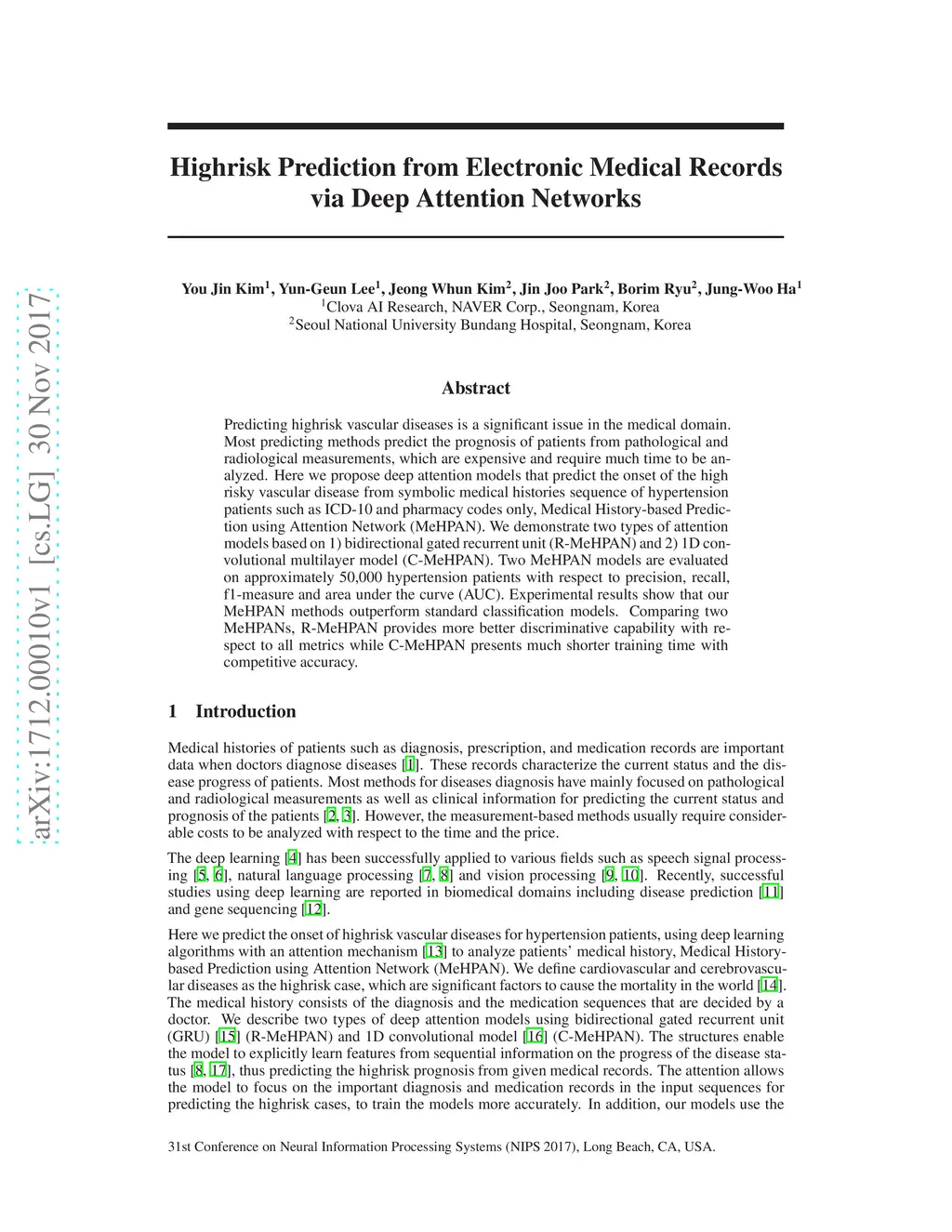 Predicting highrisk vascular diseases is a significant issue in the medical domain. Most predicting methods predict the prognosis of patients from pathological and radiological measurements, which are expensive and require much time to be analyzed. Here we propose deep attention models that predict the onset of the high risky vascular disease from symbolic medical histories sequence of hypertension patients such as ICD-10 and pharmacy codes only, Medical History-based Prediction using Attention Network (MeHPAN). We demonstrate two types of attention models based on 1) bidirectional gated recurrent unit (R-MeHPAN) and 2) 1D convolutional multilayer model (C-MeHPAN). Two MeHPAN models are evaluated on approximately 50,000 hypertension patients with respect to precision, recall, f1-measure and area under the curve (AUC). Experimental results show that our MeHPAN methods outperform standard classification models. Comparing two MeHPANs, R-MeHPAN provides more better discriminative capability with respect to all metrics while C-MeHPAN presents much shorter training time with competitive accuracy.