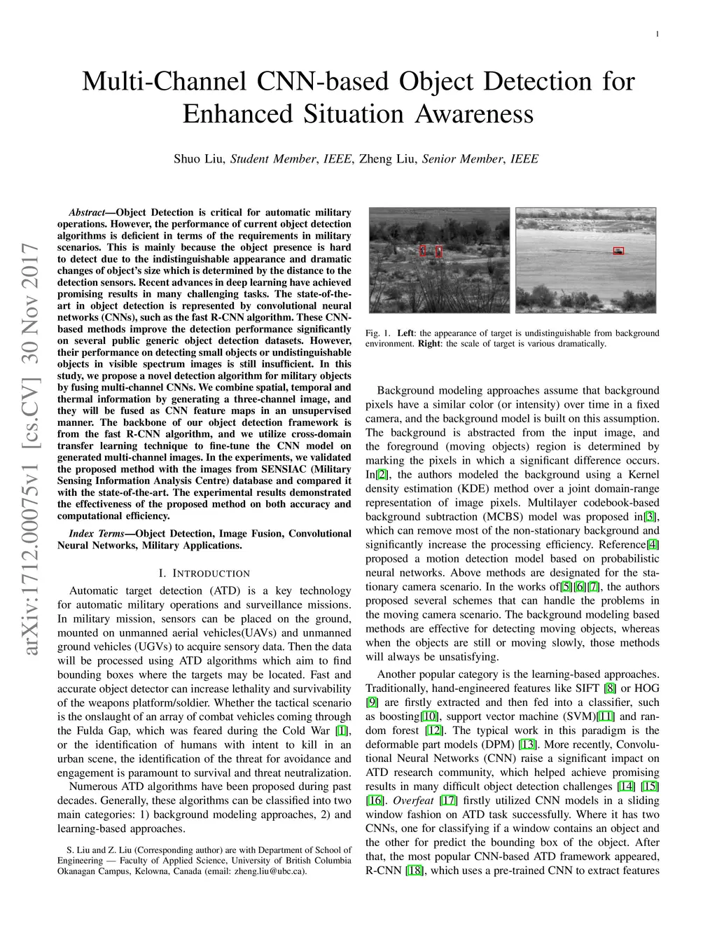 Object Detection is critical for automatic military operations. However, the performance of current object detection algorithms is deficient in terms of the requirements in military scenarios. This is mainly because the object presence is hard to detect due to the indistinguishable appearance and dramatic changes of object's size which is determined by the distance to the detection sensors. Recent advances in deep learning have achieved promising results in many challenging tasks. The state-of-the-art in object detection is represented by convolutional neural networks (CNNs), such as the fast R-CNN algorithm. These CNN-based methods improve the detection performance significantly on several public generic object detection datasets. However, their performance on detecting small objects or undistinguishable objects in visible spectrum images is still insufficient. In this study, we propose a novel detection algorithm for military objects by fusing multi-channel CNNs. We combine spatial, temporal and thermal information by generating a three-channel image, and they will be fused as CNN feature maps in an unsupervised manner. The backbone of our object detection framework is from the fast R-CNN algorithm, and we utilize cross-domain transfer learning technique to fine-tune the CNN model on generated multi-channel images. In the experiments, we validated the proposed method with the images from SENSIAC (Military Sensing Information Analysis Centre) database and compared it with the state-of-the-art. The experimental results demonstrated the effectiveness of the proposed method on both accuracy and computational efficiency.
