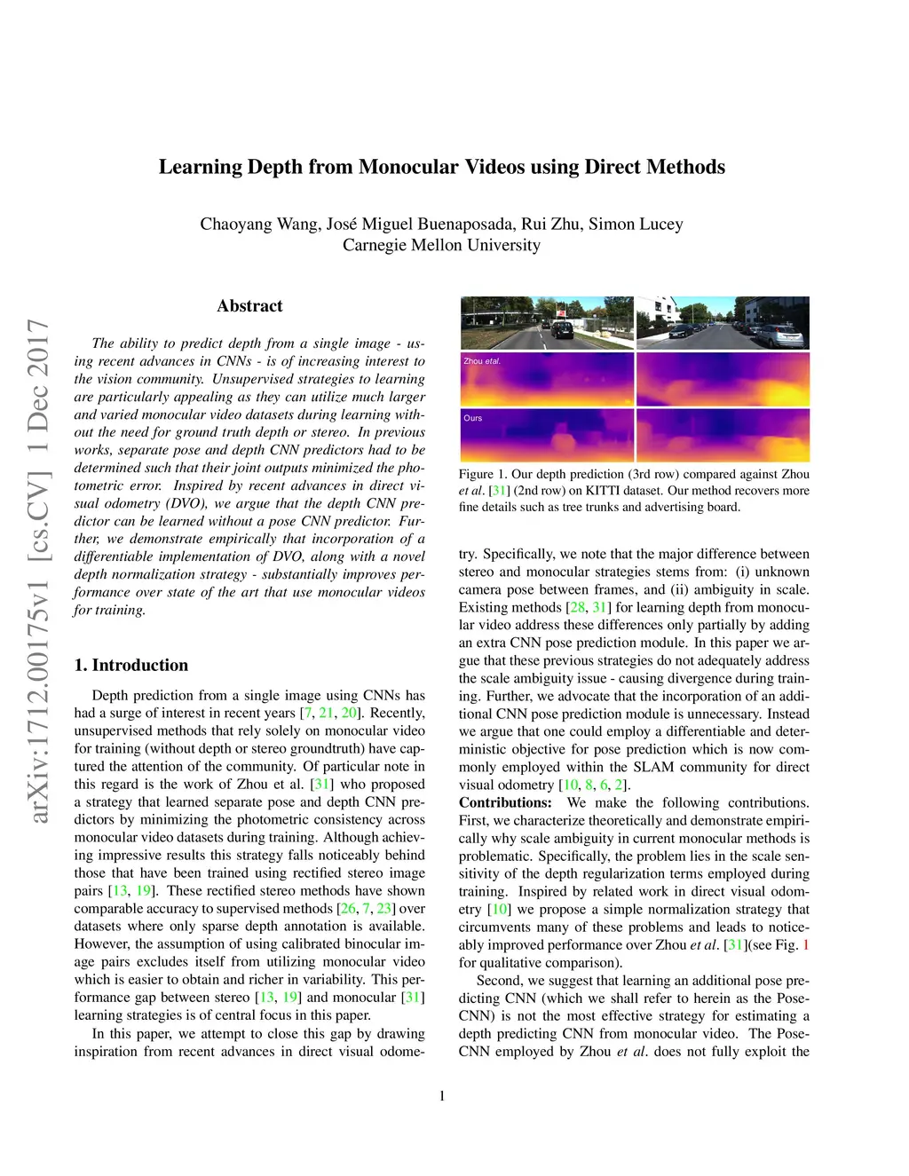 The ability to predict depth from a single image - using recent advances in CNNs - is of increasing interest to the vision community. Unsupervised strategies to learning are particularly appealing as they can utilize much larger and varied monocular video datasets during learning without the need for ground truth depth or stereo. In previous works, separate pose and depth CNN predictors had to be determined such that their joint outputs minimized the photometric error. Inspired by recent advances in direct visual odometry (DVO), we argue that the depth CNN predictor can be learned without a pose CNN predictor. Further, we demonstrate empirically that incorporation of a differentiable implementation of DVO, along with a novel depth normalization strategy - substantially improves performance over state of the art that use monocular videos for training.