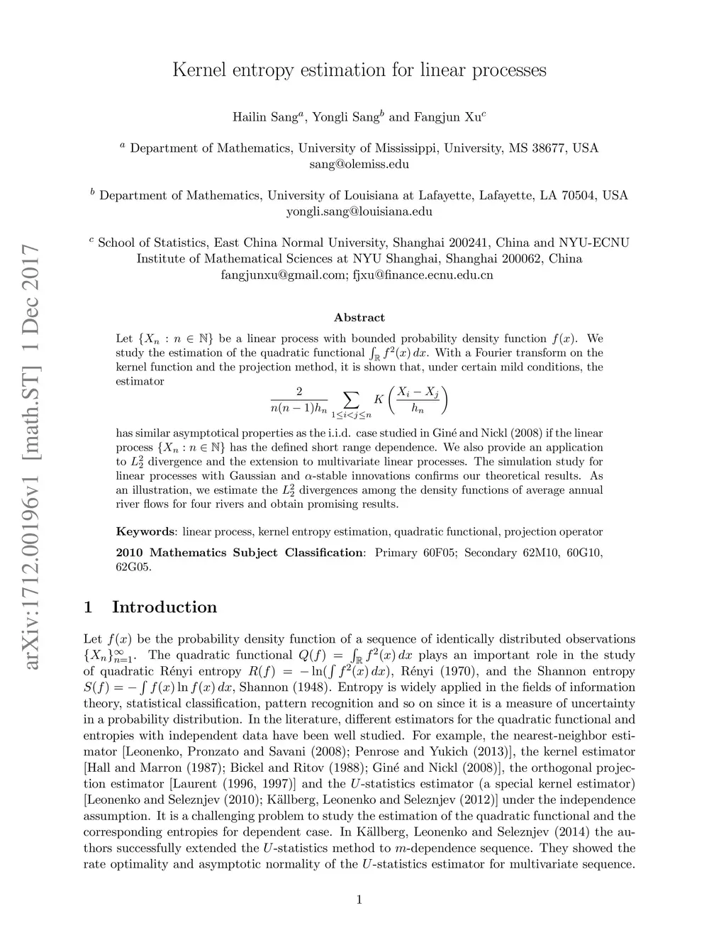 Let be a linear process with bounded probability density function . We study the estimation of the quadratic functional . With a Fourier transform on the kernel function and the projection method, it is shown that, under certain mild conditions, the estimator \[ \frac{2}{n(n-1)h_n} \sum_{1\le i<j\le n}K\left(\frac{X_i-X_j}{h_n}\right) \] has similar asymptotical properties as the i.i.d. case studied in Gin\'{e} and Nickl (2008) if the linear process has the defined short range dependence. We also provide an application to divergence and the extension to multivariate linear processes. The simulation study for linear processes with Gaussian and -stable innovations confirms our theoretical results. As an illustration, we estimate the divergences among the density functions of average annual river flows for four rivers and obtain promising results.