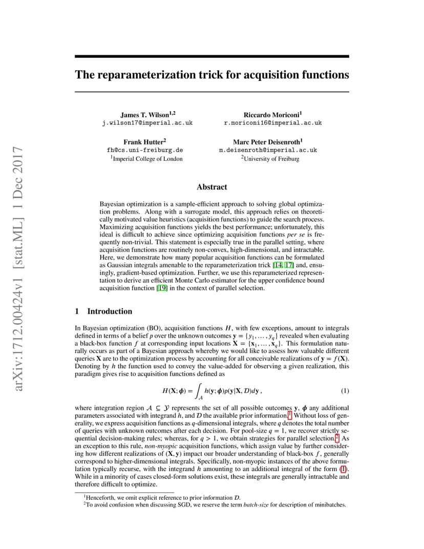 Bayesian optimization is a sample-efficient approach to solving global optimization problems. Along with a surrogate model, this approach relies on theoretically motivated value heuristics (acquisition functions) to guide the search process. Maximizing acquisition functions yields the best performance; unfortunately, this ideal is difficult to achieve since optimizing acquisition functions per se is frequently non-trivial. This statement is especially true in the parallel setting, where acquisition functions are routinely non-convex, high-dimensional, and intractable. Here, we demonstrate how many popular acquisition functions can be formulated as Gaussian integrals amenable to the reparameterization trick and, ensuingly, gradient-based optimization. Further, we use this reparameterized representation to derive an efficient Monte Carlo estimator for the upper confidence bound acquisition function in the context of parallel selection.