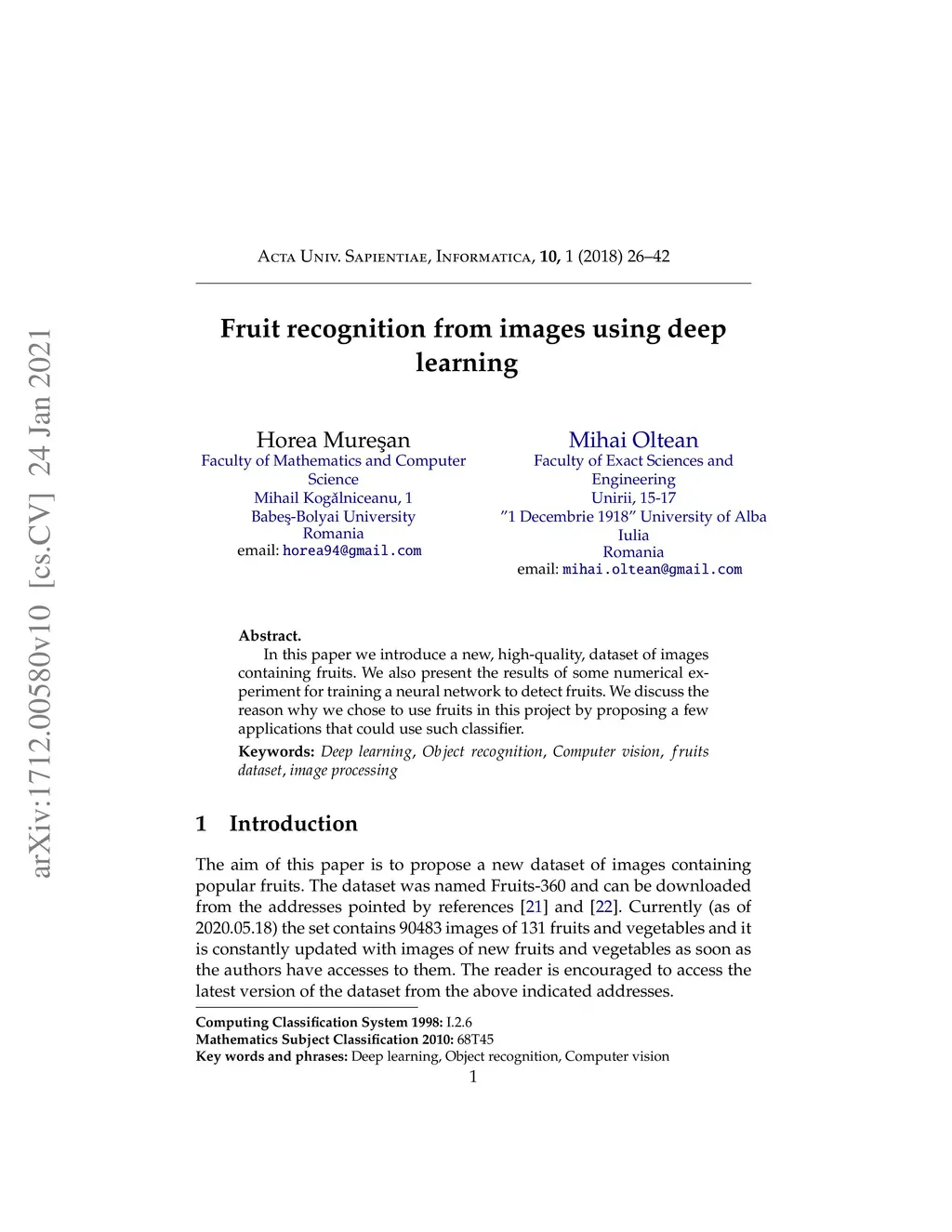 In this paper we introduce a new, high-quality, dataset of images containing fruits. We also present the results of some numerical experiment for training a neural network to detect fruits. We discuss the reason why we chose to use fruits in this project by proposing a few applications that could use this kind of neural network.