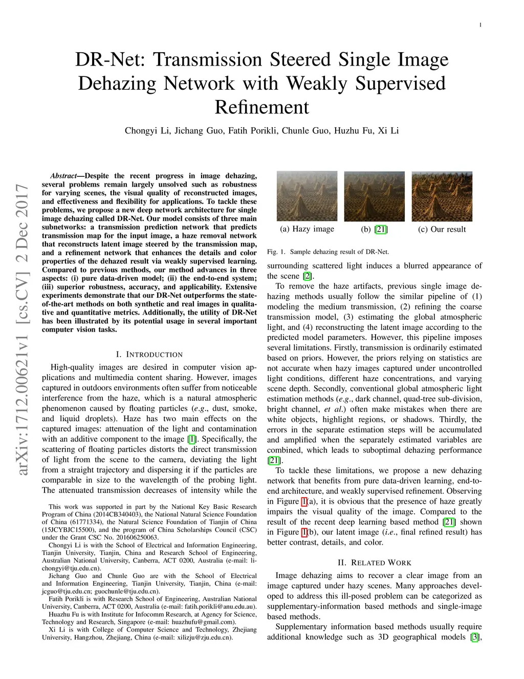 Despite the recent progress in image dehazing, several problems remain largely unsolved such as robustness for varying scenes, the visual quality of reconstructed images, and effectiveness and flexibility for applications. To tackle these problems, we propose a new deep network architecture for single image dehazing called DR-Net. Our model consists of three main subnetworks: a transmission prediction network that predicts transmission map for the input image, a haze removal network that reconstructs latent image steered by the transmission map, and a refinement network that enhances the details and color properties of the dehazed result via weakly supervised learning. Compared to previous methods, our method advances in three aspects: (i) pure data-driven model; (ii) the end-to-end system; (iii) superior robustness, accuracy, and applicability. Extensive experiments demonstrate that our DR-Net outperforms the state-of-the-art methods on both synthetic and real images in qualitative and quantitative metrics. Additionally, the utility of DR-Net has been illustrated by its potential usage in several important computer vision tasks.