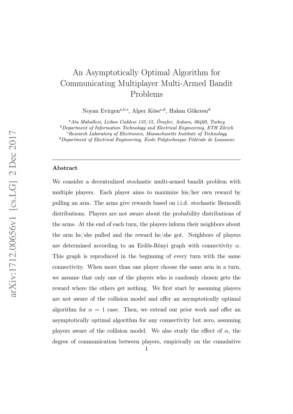 We consider a decentralized stochastic multi-armed bandit problem with multiple players. Each player aims to maximize his/her own reward by pulling an arm. The arms give rewards based on i.i.d. stochastic Bernoulli distributions. Players are not aware about the probability distributions of the arms. At the end of each turn, the players inform their neighbors about the arm he/she pulled and the reward he/she got. Neighbors of players are determined according to an Erd{\H{o}}s-R{\é}nyi graph with connectivity . This graph is reproduced in the beginning of every turn with the same connectivity. When more than one player choose the same arm in a turn, we assume that only one of the players who is randomly chosen gets the reward where the others get nothing. We first start by assuming players are not aware of the collision model and offer an asymptotically optimal algorithm for case. Then, we extend our prior work and offer an asymptotically optimal algorithm for any connectivity but zero, assuming players aware of the collision model. We also study the effect of , the degree of communication between players, empirically on the cumulative regret by comparing them with traditional multi-armed bandit algorithms.