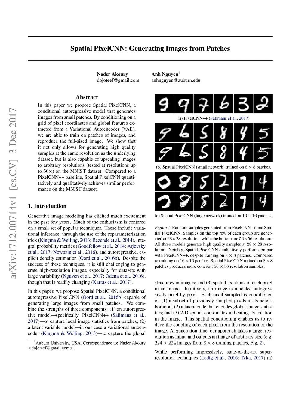 In this paper we propose Spatial PixelCNN, a conditional autoregressive model that generates images from small patches. By conditioning on a grid of pixel coordinates and global features extracted from a Variational Autoencoder (VAE), we are able to train on patches of images, and reproduce the full-sized image. We show that it not only allows for generating high quality samples at the same resolution as the underlying dataset, but is also capable of upscaling images to arbitrary resolutions (tested at resolutions up to ) on the MNIST dataset. Compared to a PixelCNN++ baseline, Spatial PixelCNN quantitatively and qualitatively achieves similar performance on the MNIST dataset.