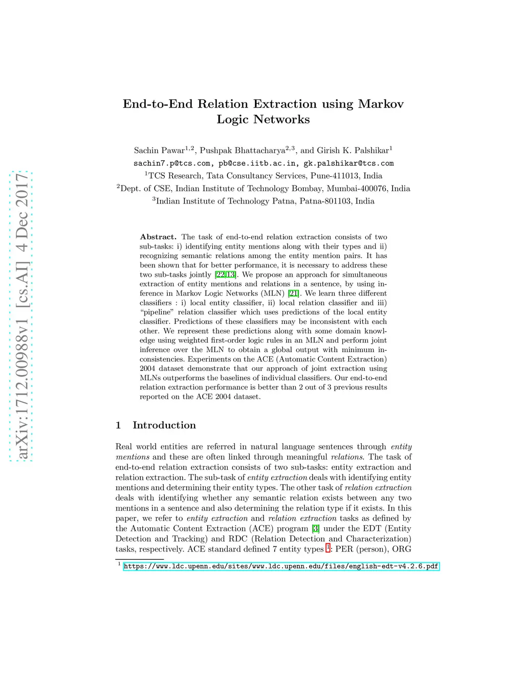 The task of end-to-end relation extraction consists of two sub-tasks: i) identifying entity mentions along with their types and ii) recognizing semantic relations among the entity mention pairs. %Identifying entity mentions along with their types and recognizing semantic relations among the entity mentions, are two very important problems in Information Extraction. It has been shown that for better performance, it is necessary to address these two sub-tasks jointly. We propose an approach for simultaneous extraction of entity mentions and relations in a sentence, by using inference in Markov Logic Networks (MLN). We learn three different classifiers : i) local entity classifier, ii) local relation classifier and iii) "pipeline" relation classifier which uses predictions of the local entity classifier. Predictions of these classifiers may be inconsistent with each other. We represent these predictions along with some domain knowledge using weighted first-order logic rules in an MLN and perform joint inference over the MLN to obtain a global output with minimum inconsistencies. Experiments on the ACE (Automatic Content Extraction) 2004 dataset demonstrate that our approach of joint extraction using MLNs outperforms the baselines of individual classifiers. Our end-to-end relation extraction performance is better than 2 out of 3 previous results reported on the ACE 2004 dataset.