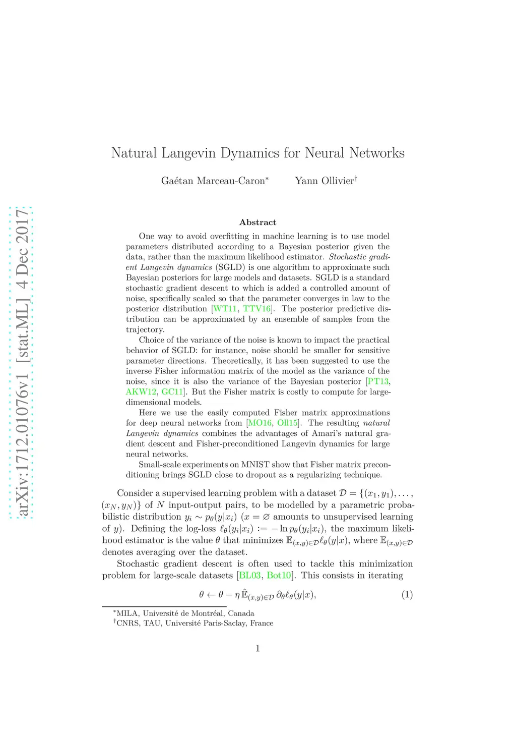 One way to avoid overfitting in machine learning is to use model parameters distributed according to a Bayesian posterior given the data, rather than the maximum likelihood estimator. Stochastic gradient Langevin dynamics (SGLD) is one algorithm to approximate such Bayesian posteriors for large models and datasets. SGLD is a standard stochastic gradient descent to which is added a controlled amount of noise, specifically scaled so that the parameter converges in law to the posterior distribution [WT11, TTV16]. The posterior predictive distribution can be approximated by an ensemble of samples from the trajectory. Choice of the variance of the noise is known to impact the practical behavior of SGLD: for instance, noise should be smaller for sensitive parameter directions. Theoretically, it has been suggested to use the inverse Fisher information matrix of the model as the variance of the noise, since it is also the variance of the Bayesian posterior [PT13, AKW12, GC11]. But the Fisher matrix is costly to compute for large- dimensional models. Here we use the easily computed Fisher matrix approximations for deep neural networks from [MO16, Oll15]. The resulting natural Langevin dynamics combines the advantages of Amari's natural gradient descent and Fisher-preconditioned Langevin dynamics for large neural networks. Small-scale experiments on MNIST show that Fisher matrix preconditioning brings SGLD close to dropout as a regularizing technique.