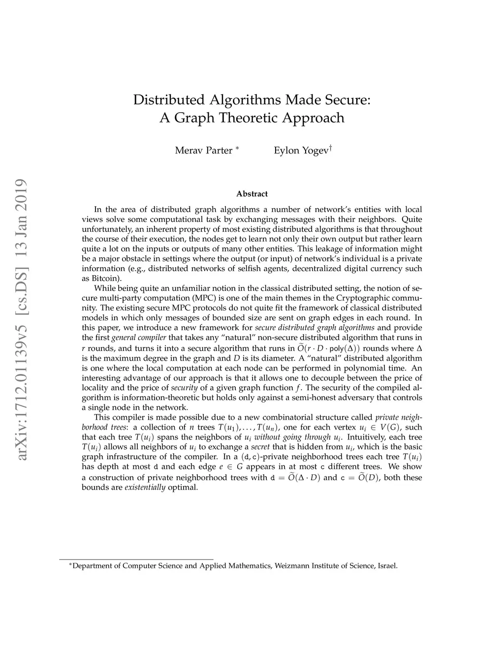 In the area of distributed graph algorithms a number of network's entities with local views solve some computational task by exchanging messages with their neighbors. Quite unfortunately, an inherent property of most existing distributed algorithms is that throughout the course of their execution, the nodes get to learn not only their own output but rather learn quite a lot on the inputs or outputs of many other entities. This leakage of information might be a major obstacle in settings where the output (or input) of network's individual is a private information (i.e. networks of selfish agents, decentralized digital currency). While being quite an unfamiliar notion in the classical distributed setting, the notion of secure multi-party computation (MPC) is one of the main themes in the Cryptographic community. Yet despite all extensive work in the area, no existing algorithm fits the framework of classical distributed models in which there are no assumptions on the graph topologies and only messages of bounded size are sent on the edges in each round. In this paper, we introduce a new framework for \emph{secure distributed graph algorithms} and provide the first \emph{general compiler} that takes any "natural" non-secure distributed algorithm that runs in rounds, and turns it into a secure algorithm that runs in rounds where is the maximum degree in the graph and is its diameter. We also show that this is nearly (existentially) optimal for any round-by-round compiler for bounded degree graphs. The main technical part of our compiler is based on a new cycle cover theorem: We show that the edges of every bridgeless graph of diameter can be covered by a collection of cycles such that each cycle is of length and each edge of the graph appears in many cycles.