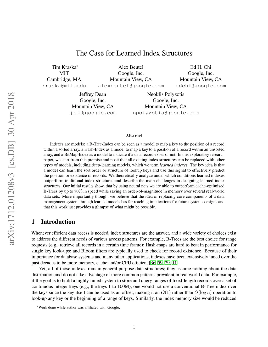 Indexes are models: a B-Tree-Index can be seen as a model to map a key to the position of a record within a sorted array, a Hash-Index as a model to map a key to a position of a record within an unsorted array, and a BitMap-Index as a model to indicate if a data record exists or not. In this exploratory research paper, we start from this premise and posit that all existing index structures can be replaced with other types of models, including deep-learning models, which we term learned indexes. The key idea is that a model can learn the sort order or structure of lookup keys and use this signal to effectively predict the position or existence of records. We theoretically analyze under which conditions learned indexes outperform traditional index structures and describe the main challenges in designing learned index structures. Our initial results show, that by using neural nets we are able to outperform cache-optimized B-Trees by up to 70% in speed while saving an order-of-magnitude in memory over several real-world data sets. More importantly though, we believe that the idea of replacing core components of a data management system through learned models has far reaching implications for future systems designs and that this work just provides a glimpse of what might be possible.
