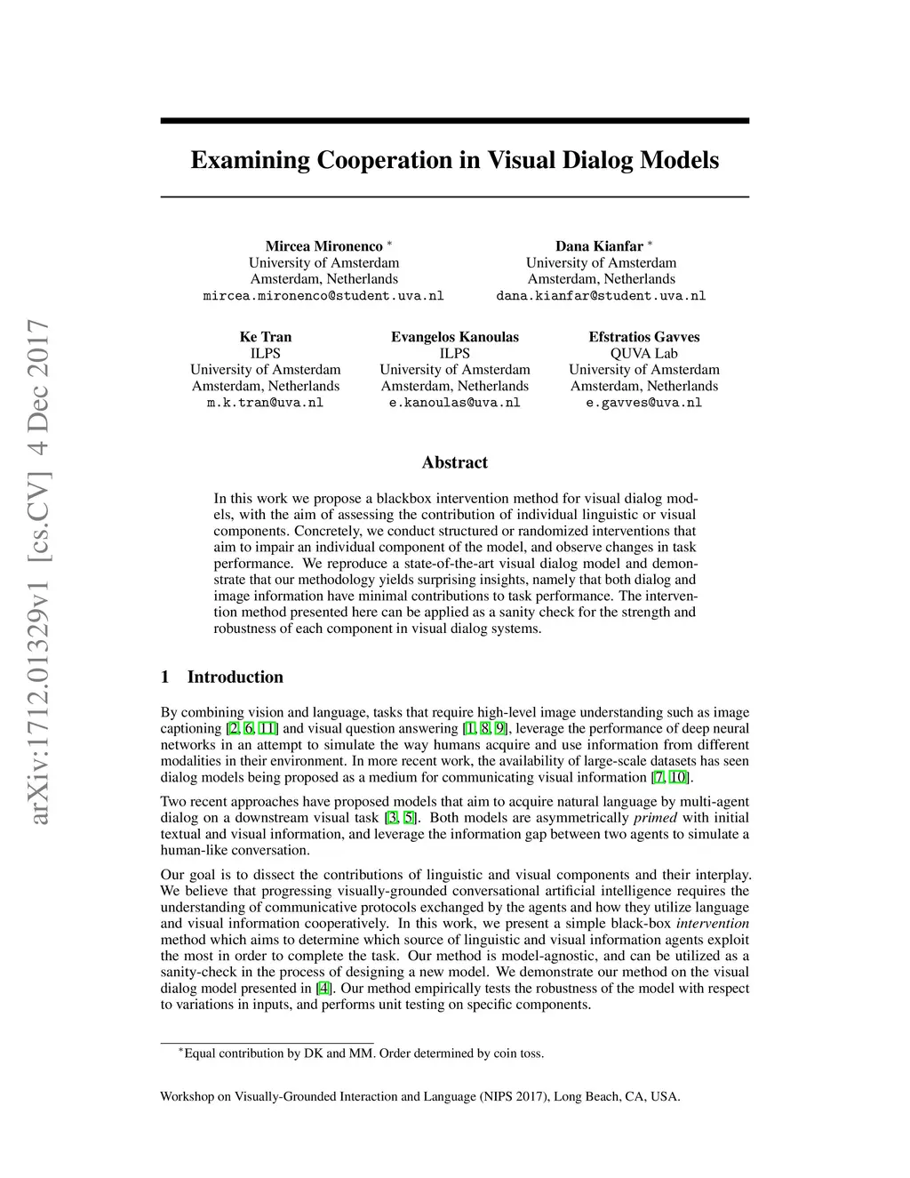 In this work we propose a blackbox intervention method for visual dialog models, with the aim of assessing the contribution of individual linguistic or visual components. Concretely, we conduct structured or randomized interventions that aim to impair an individual component of the model, and observe changes in task performance. We reproduce a state-of-the-art visual dialog model and demonstrate that our methodology yields surprising insights, namely that both dialog and image information have minimal contributions to task performance. The intervention method presented here can be applied as a sanity check for the strength and robustness of each component in visual dialog systems.
