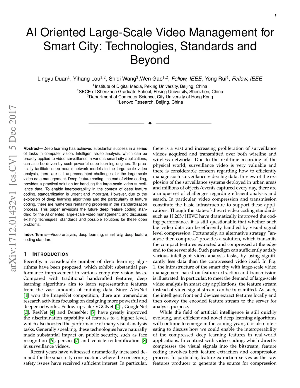 Deep learning has achieved substantial success in a series of tasks in computer vision. Intelligent video analysis, which can be broadly applied to video surveillance in various smart city applications, can also be driven by such powerful deep learning engines. To practically facilitate deep neural network models in the large-scale video analysis, there are still unprecedented challenges for the large-scale video data management. Deep feature coding, instead of video coding, provides a practical solution for handling the large-scale video surveillance data. To enable interoperability in the context of deep feature coding, standardization is urgent and important. However, due to the explosion of deep learning algorithms and the particularity of feature coding, there are numerous remaining problems in the standardization process. This paper envisions the future deep feature coding standard for the AI oriented large-scale video management, and discusses existing techniques, standards and possible solutions for these open problems.