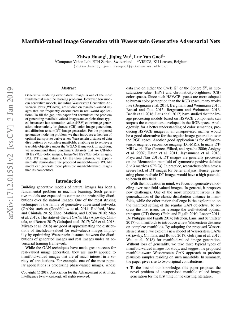 Generative modeling over natural images is one of the most fundamental machine learning problems. However, few modern generative models, including Wasserstein Generative Adversarial Nets (WGANs), are studied on manifold-valued images that are frequently encountered in real-world applications. To fill the gap, this paper first formulates the problem of generating manifold-valued images and exploits three typical instances: hue-saturation-value (HSV) color image generation, chromaticity-brightness (CB) color image generation, and diffusion-tensor (DT) image generation. For the proposed generative modeling problem, we then introduce a theorem of optimal transport to derive a new Wasserstein distance of data distributions on complete manifolds, enabling us to achieve a tractable objective under the WGAN framework. In addition, we recommend three benchmark datasets that are CIFAR-10 HSV/CB color images, ImageNet HSV/CB color images, UCL DT image datasets. On the three datasets, we experimentally demonstrate the proposed manifold-aware WGAN model can generate more plausible manifold-valued images than its competitors.