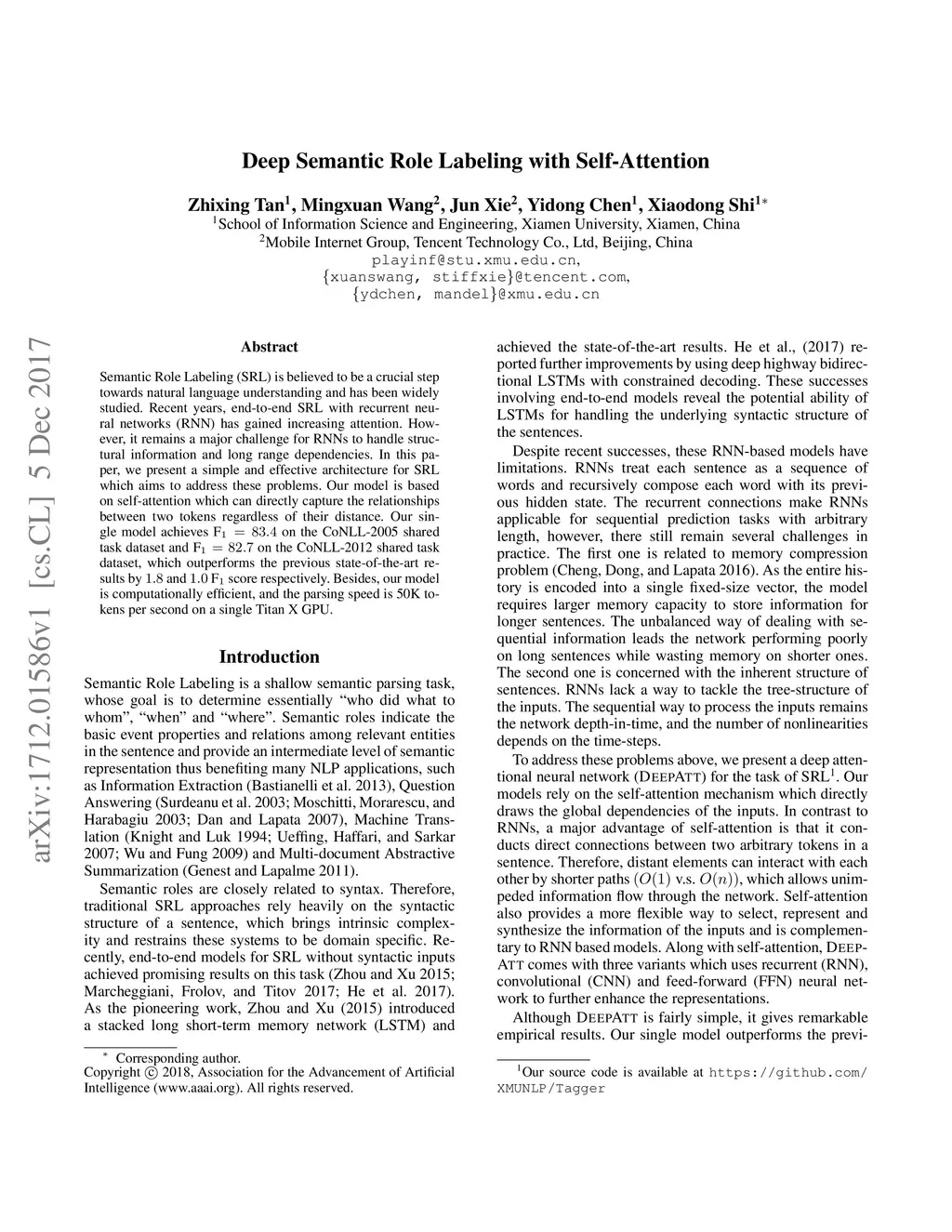 Semantic Role Labeling (SRL) is believed to be a crucial step towards natural language understanding and has been widely studied. Recent years, end-to-end SRL with recurrent neural networks (RNN) has gained increasing attention. However, it remains a major challenge for RNNs to handle structural information and long range dependencies. In this paper, we present a simple and effective architecture for SRL which aims to address these problems. Our model is based on self-attention which can directly capture the relationships between two tokens regardless of their distance. Our single model achieves F on the CoNLL-2005 shared task dataset and F on the CoNLL-2012 shared task dataset, which outperforms the previous state-of-the-art results by and F score respectively. Besides, our model is computationally efficient, and the parsing speed is 50K tokens per second on a single Titan X GPU.