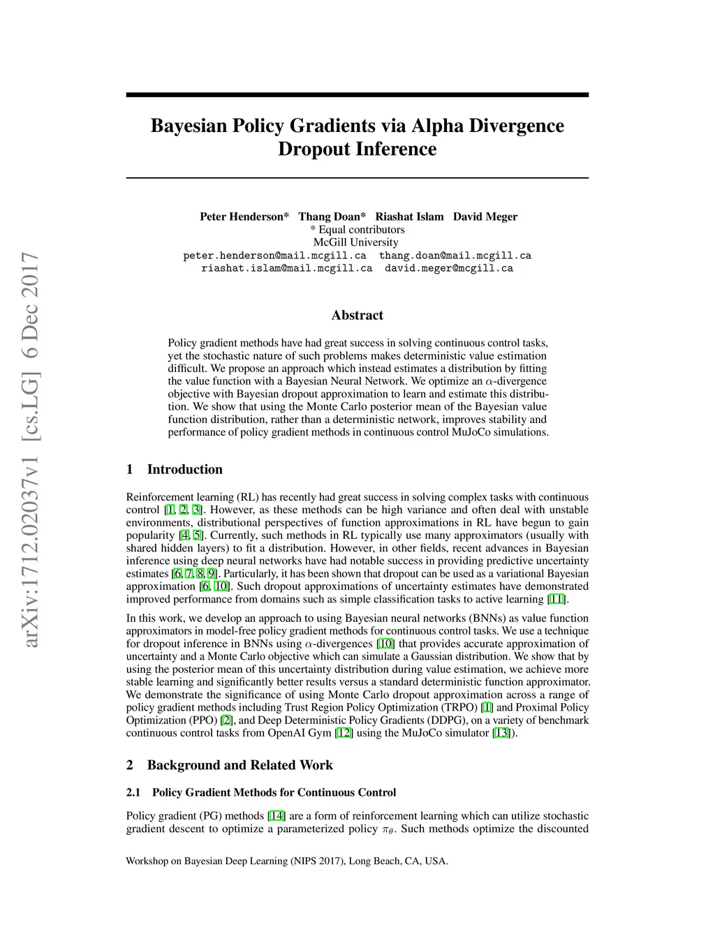 Bayesian Policy Gradients via Alpha Divergence Dropout Inference