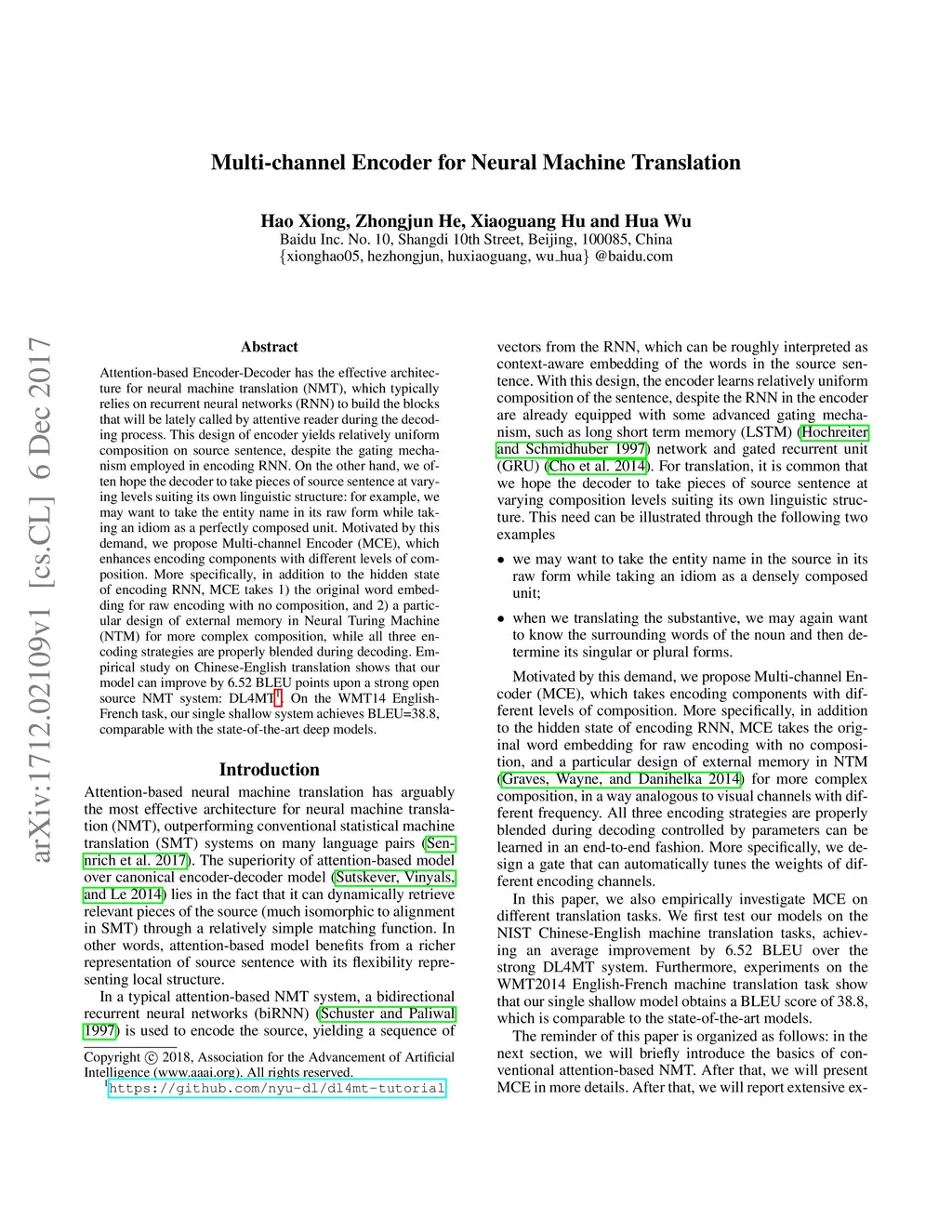 Multi-channel Encoder for Neural Machine Translation
