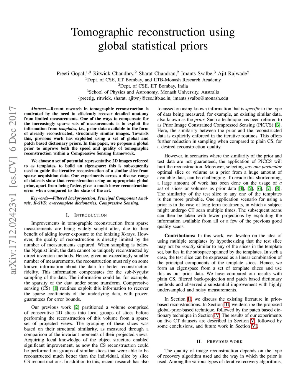 Recent research in tomographic reconstruction is motivated by the need to efficiently recover detailed anatomy from limited measurements. One of the ways to compensate for the increasingly sparse sets of measurements is to exploit the information from templates, i.e., prior data available in the form of already reconstructed, structurally similar images. Towards this, previous work has exploited using a set of global and patch based dictionary priors. In this paper, we propose a global prior to improve both the speed and quality of tomographic reconstruction within a Compressive Sensing framework. We choose a set of potential representative 2D images referred to as templates, to build an eigenspace; this is subsequently used to guide the iterative reconstruction of a similar slice from sparse acquisition data. Our experiments across a diverse range of datasets show that reconstruction using an appropriate global prior, apart from being faster, gives a much lower reconstruction error when compared to the state of the art.