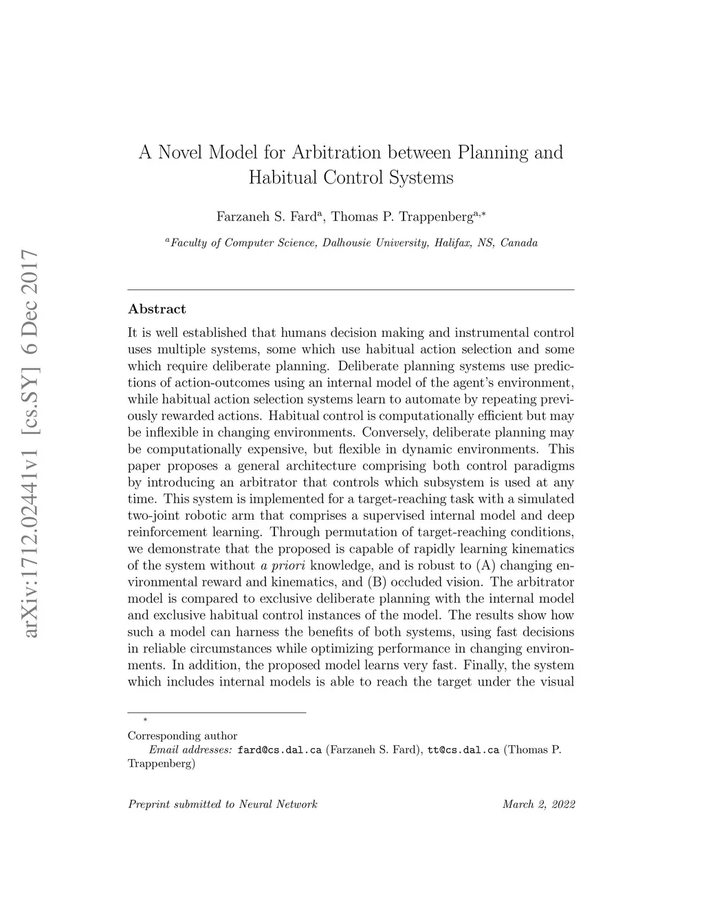 It is well established that humans decision making and instrumental control uses multiple systems, some which use habitual action selection and some which require deliberate planning. Deliberate planning systems use predictions of action-outcomes using an internal model of the agent's environment, while habitual action selection systems learn to automate by repeating previously rewarded actions. Habitual control is computationally efficient but may be inflexible in changing environments. Conversely, deliberate planning may be computationally expensive, but flexible in dynamic environments. This paper proposes a general architecture comprising both control paradigms by introducing an arbitrator that controls which subsystem is used at any time. This system is implemented for a target-reaching task with a simulated two-joint robotic arm that comprises a supervised internal model and deep reinforcement learning. Through permutation of target-reaching conditions, we demonstrate that the proposed is capable of rapidly learning kinematics of the system without a priori knowledge, and is robust to (A) changing environmental reward and kinematics, and (B) occluded vision. The arbitrator model is compared to exclusive deliberate planning with the internal model and exclusive habitual control instances of the model. The results show how such a model can harness the benefits of both systems, using fast decisions in reliable circumstances while optimizing performance in changing environments. In addition, the proposed model learns very fast. Finally, the system which includes internal models is able to reach the target under the visual occlusion, while the pure habitual system is unable to operate sufficiently under such conditions.