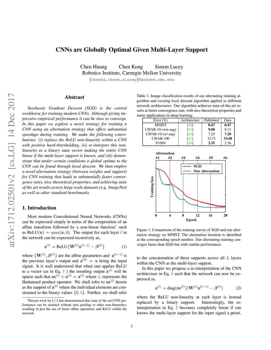 Stochastic Gradient Descent (SGD) is the central workhorse for training modern CNNs. Although giving impressive empirical performance it can be slow to converge. In this paper we explore a novel strategy for training a CNN using an alternation strategy that offers substantial speedups during training. We make the following contributions: (i) replace the ReLU non-linearity within a CNN with positive hard-thresholding, (ii) reinterpret this non-linearity as a binary state vector making the entire CNN linear if the multi-layer support is known, and (iii) demonstrate that under certain conditions a global optima to the CNN can be found through local descent. We then employ a novel alternation strategy (between weights and support) for CNN training that leads to substantially faster convergence rates, nice theoretical properties, and achieving state of the art results across large scale datasets (e.g. ImageNet) as well as other standard benchmarks.