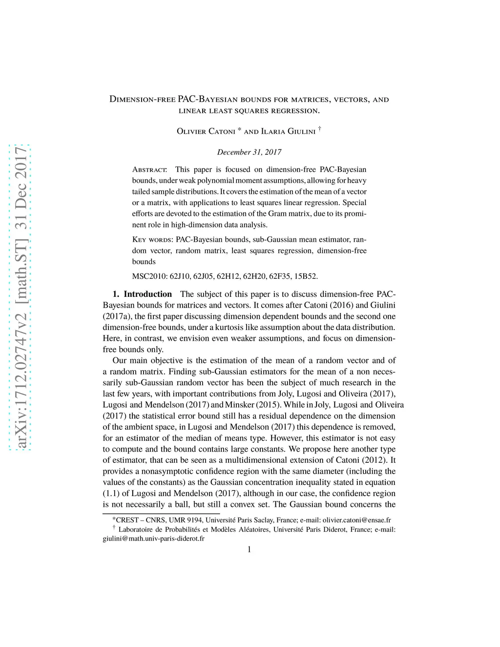 This paper is focused on dimension-free PAC-Bayesian bounds, under weak polynomial moment assumptions, allowing for heavy tailed sample distributions. It covers the estimation of the mean of a vector or a matrix, with applications to least squares linear regression. Special efforts are devoted to the estimation of Gram matrices, due to their prominent role in high-dimension data analysis.