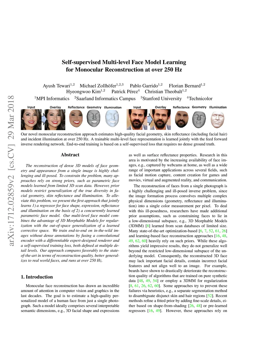The reconstruction of dense 3D models of face geometry and appearance from a single image is highly challenging and ill-posed. To constrain the problem, many approaches rely on strong priors, such as parametric face models learned from limited 3D scan data. However, prior models restrict generalization of the true diversity in facial geometry, skin reflectance and illumination. To alleviate this problem, we present the first approach that jointly learns 1) a regressor for face shape, expression, reflectance and illumination on the basis of 2) a concurrently learned parametric face model. Our multi-level face model combines the advantage of 3D Morphable Models for regularization with the out-of-space generalization of a learned corrective space. We train end-to-end on in-the-wild images without dense annotations by fusing a convolutional encoder with a differentiable expert-designed renderer and a self-supervised training loss, both defined at multiple detail levels. Our approach compares favorably to the state-of-the-art in terms of reconstruction quality, better generalizes to real world faces, and runs at over 250 Hz.