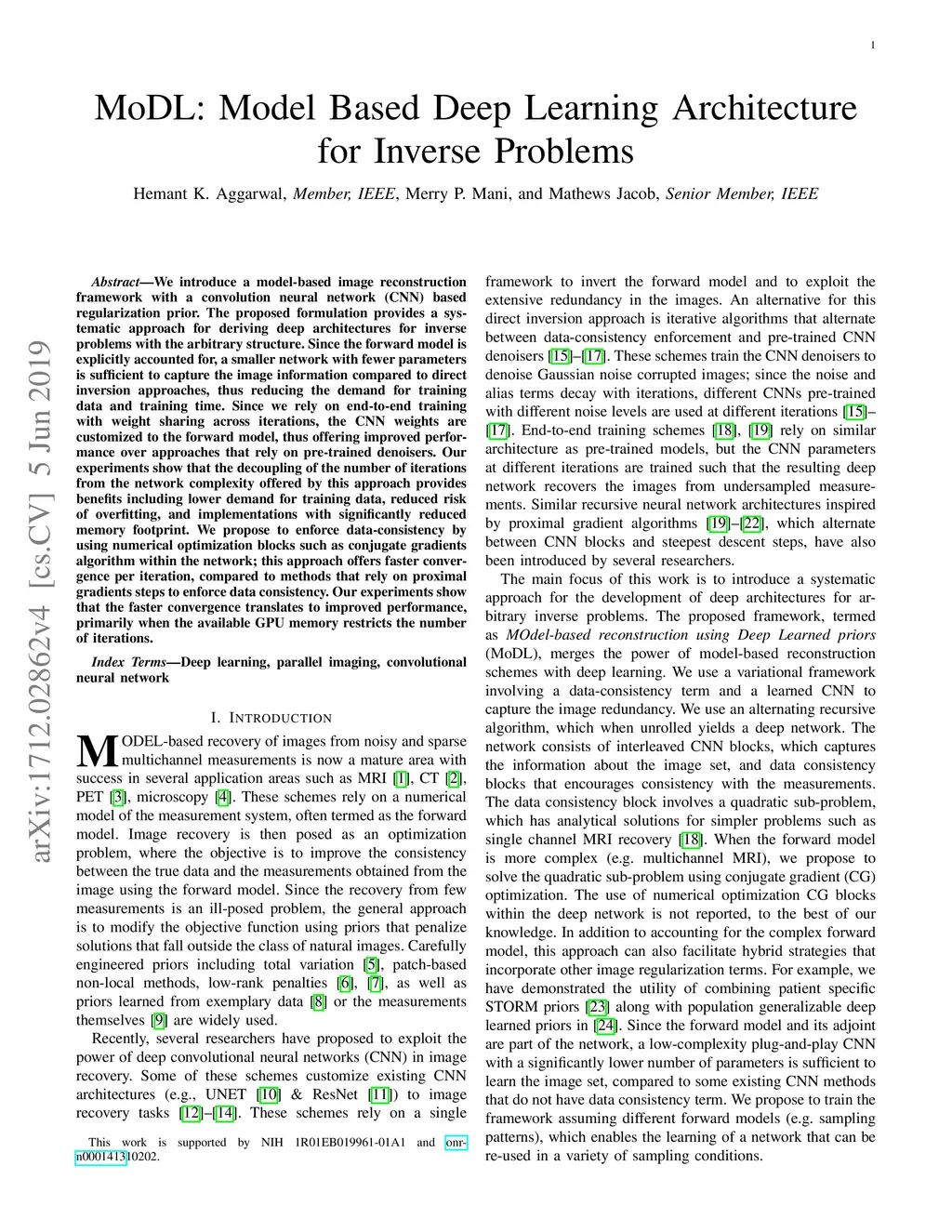 MoDL: Model Based Deep Learning Architecture for Inverse Problems