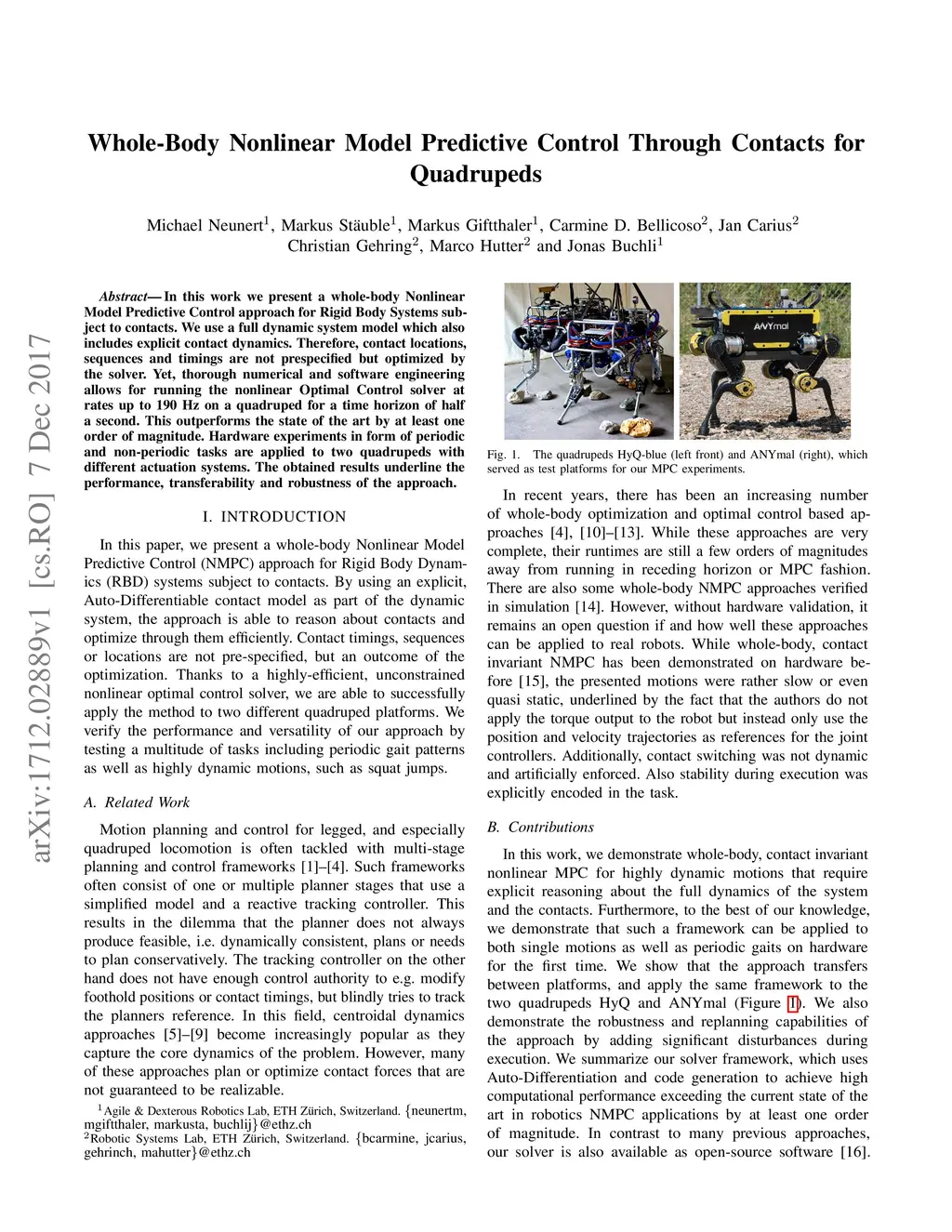In this work we present a whole-body Nonlinear Model Predictive Control approach for Rigid Body Systems subject to contacts. We use a full dynamic system model which also includes explicit contact dynamics. Therefore, contact locations, sequences and timings are not prespecified but optimized by the solver. Yet, thorough numerical and software engineering allows for running the nonlinear Optimal Control solver at rates up to 190 Hz on a quadruped for a time horizon of half a second. This outperforms the state of the art by at least one order of magnitude. Hardware experiments in form of periodic and non-periodic tasks are applied to two quadrupeds with different actuation systems. The obtained results underline the performance, transferability and robustness of the approach.