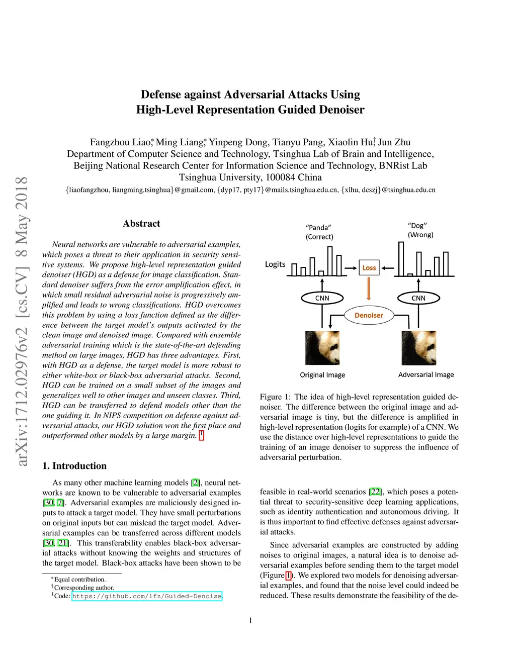 Neural networks are vulnerable to adversarial examples, which poses a threat to their application in security sensitive systems. We propose high-level representation guided denoiser (HGD) as a defense for image classification. Standard denoiser suffers from the error amplification effect, in which small residual adversarial noise is progressively amplified and leads to wrong classifications. HGD overcomes this problem by using a loss function defined as the difference between the target model's outputs activated by the clean image and denoised image. Compared with ensemble adversarial training which is the state-of-the-art defending method on large images, HGD has three advantages. First, with HGD as a defense, the target model is more robust to either white-box or black-box adversarial attacks. Second, HGD can be trained on a small subset of the images and generalizes well to other images and unseen classes. Third, HGD can be transferred to defend models other than the one guiding it. In NIPS competition on defense against adversarial attacks, our HGD solution won the first place and outperformed other models by a large margin.