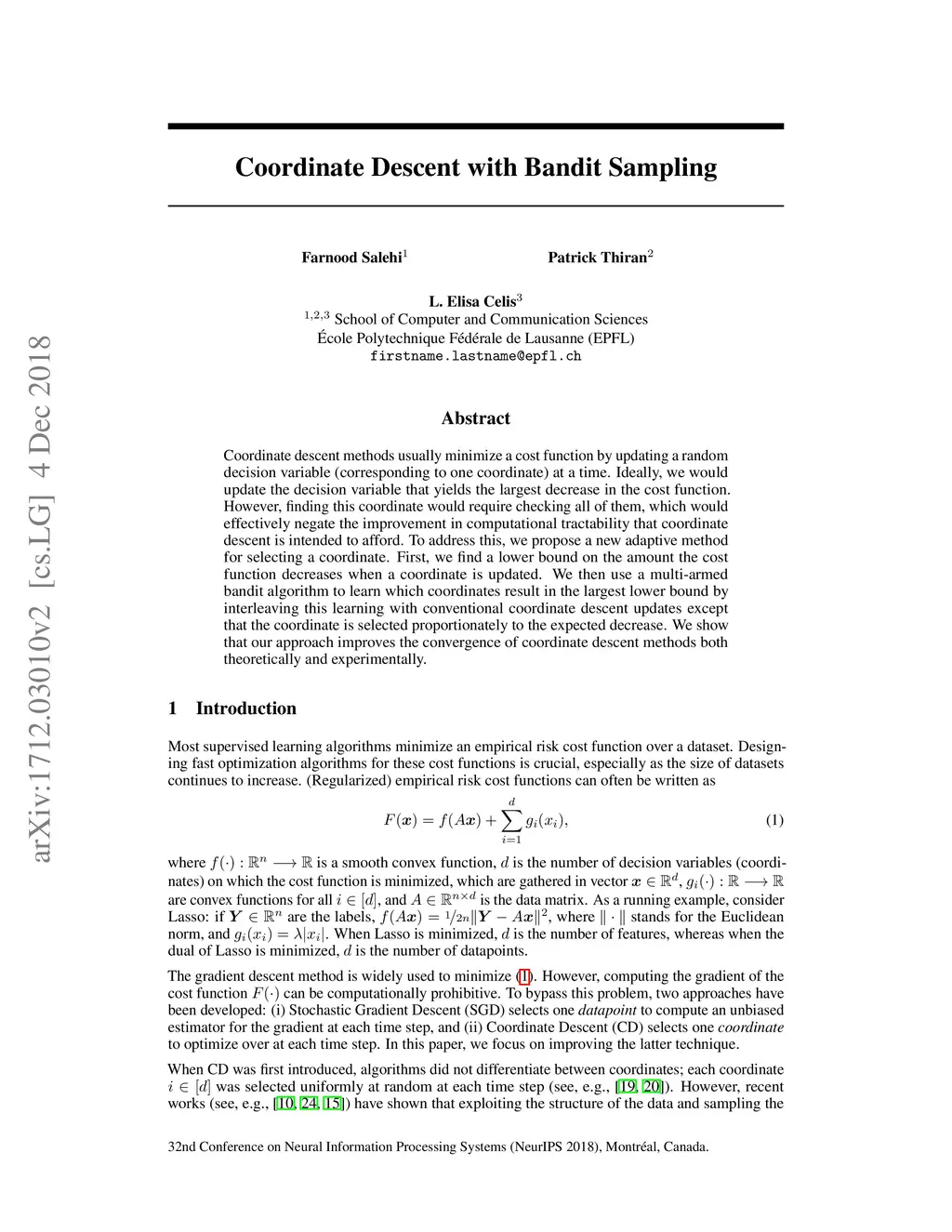 Coordinate descent methods minimize a cost function by updating a single decision variable (corresponding to one coordinate) at a time. Ideally, one would update the decision variable that yields the largest marginal decrease in the cost function. However, finding this coordinate would require checking all of them, which is not computationally practical. We instead propose a new adaptive method for coordinate descent. First, we define a lower bound on the decrease of the cost function when a coordinate is updated and, instead of calculating this lower bound for all coordinates, we use a multi-armed bandit algorithm to learn which coordinates result in the largest marginal decrease while simultaneously performing coordinate descent. We show that our approach improves the convergence of the coordinate methods (including parallel versions) both theoretically and experimentally.
