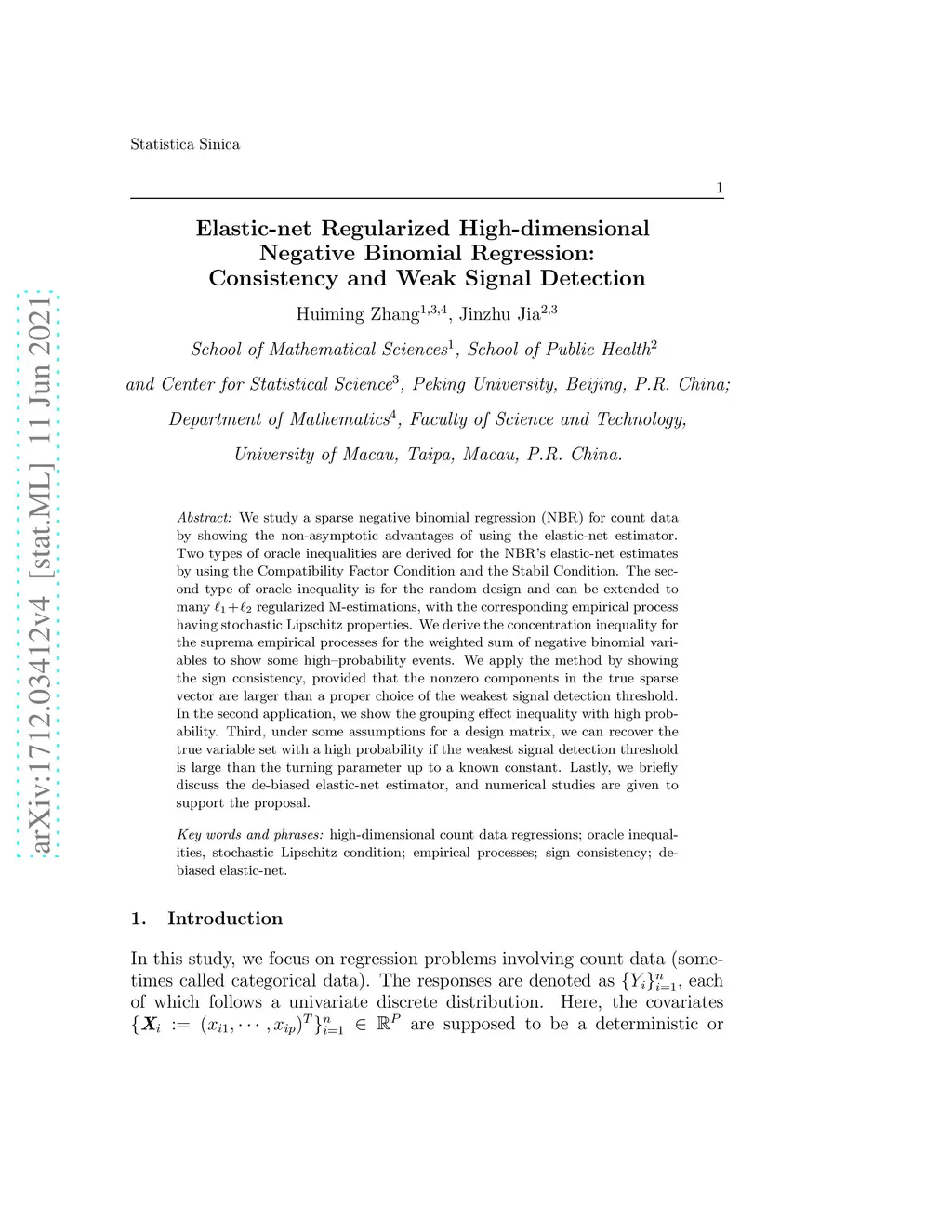 We study a sparse negative binomial regression (NBR) for count data by showing the non-asymptotic advantages of using the elastic-net estimator. Two types of oracle inequalities are derived for the NBR's elastic-net estimates by using the Compatibility Factor Condition and the Stabil Condition. The second type of oracle inequality is for the random design and can be extended to many regularized M-estimations, with the corresponding empirical process having stochastic Lipschitz properties. We derive the concentration inequality for the suprema empirical processes for the weighted sum of negative binomial variables to show some high--probability events. We apply the method by showing the sign consistency, provided that the nonzero components in the true sparse vector are larger than a proper choice of the weakest signal detection threshold. In the second application, we show the grouping effect inequality with high probability. Third, under some assumptions for a design matrix, we can recover the true variable set with a high probability if the weakest signal detection threshold is large than the turning parameter up to a known constant. Lastly, we briefly discuss the de-biased elastic-net estimator, and numerical studies are given to support the proposal.