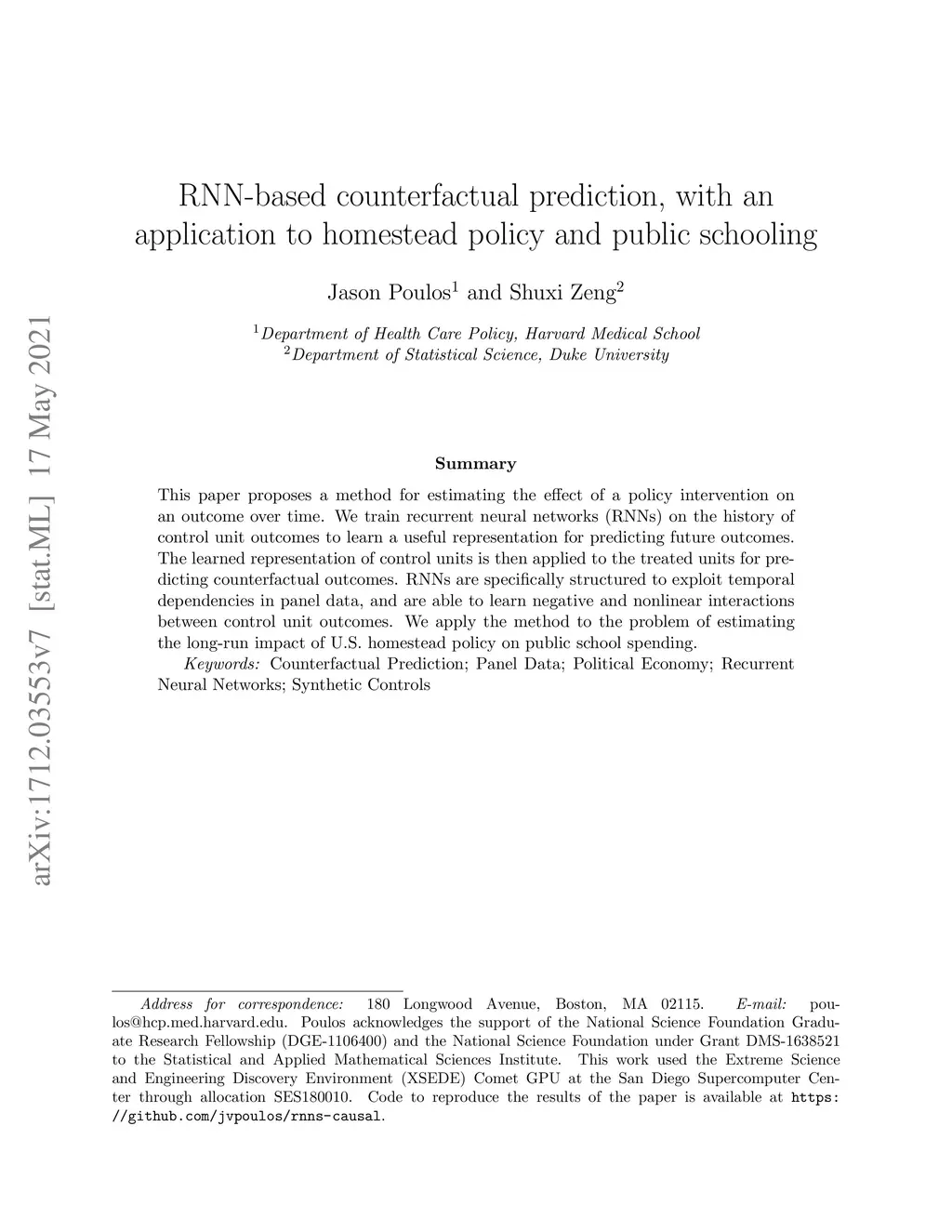 This paper proposes a method for estimating the effect of a policy intervention on an outcome over time. We train recurrent neural networks (RNNs) on the history of control unit outcomes to learn a useful representation for predicting future outcomes. The learned representation of control units is then applied to the treated units for predicting counterfactual outcomes. RNNs are specifically structured to exploit temporal dependencies in panel data, and are able to learn negative and nonlinear interactions between control unit outcomes. We apply the method to the problem of estimating the long-run impact of U.S. homestead policy on public school spending.