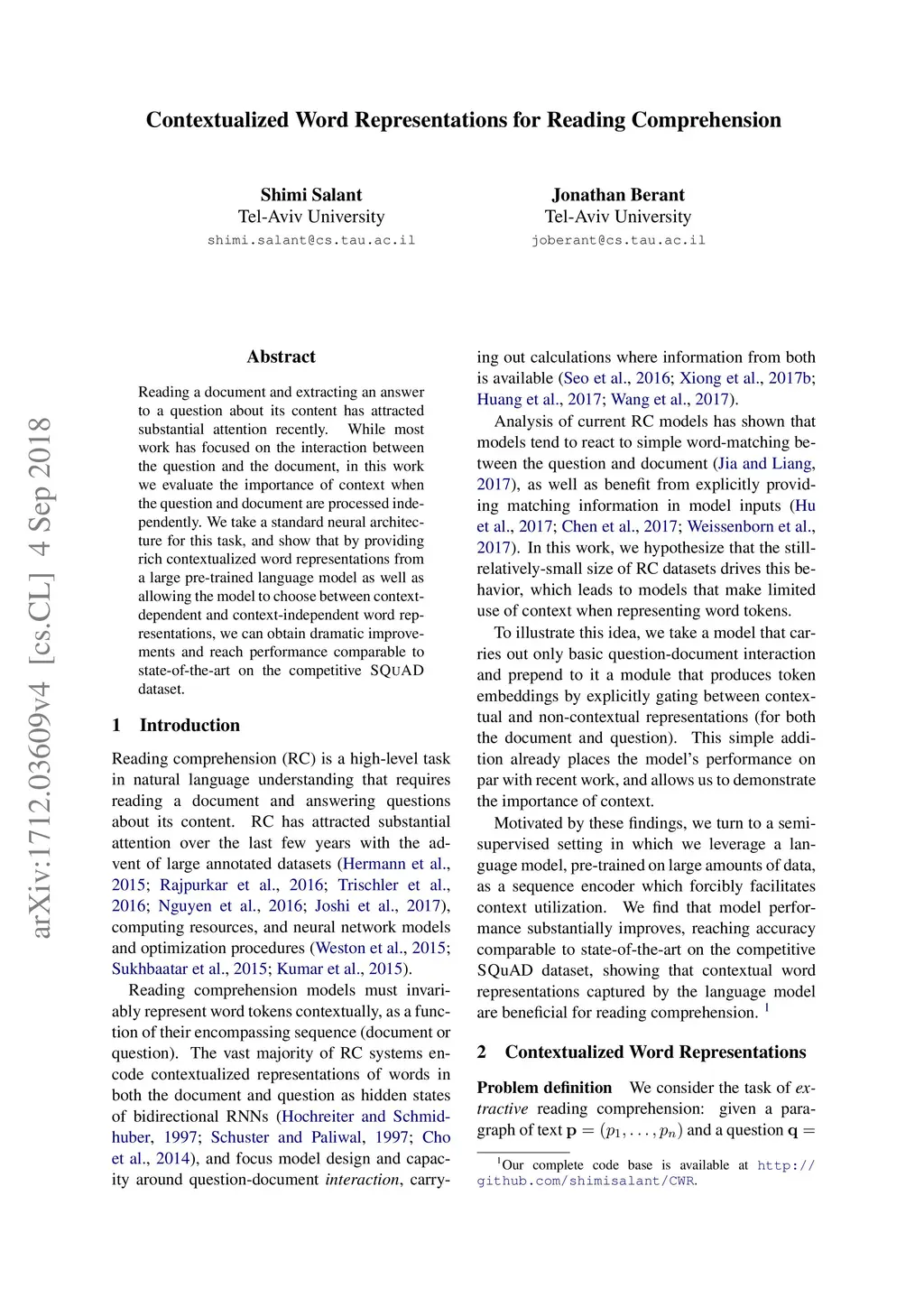 Contextualized Word Representations for Reading Comprehension