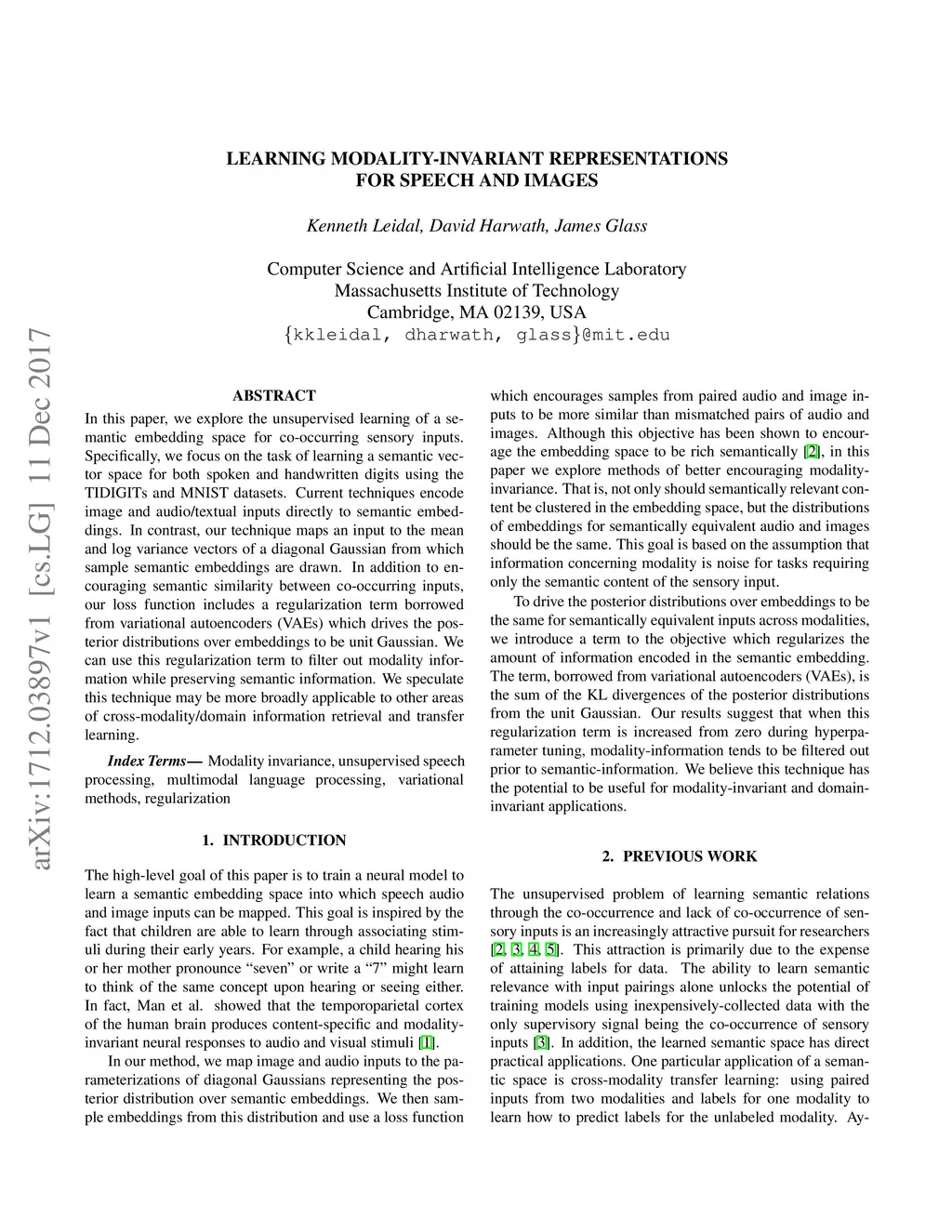 In this paper, we explore the unsupervised learning of a semantic embedding space for co-occurring sensory inputs. Specifically, we focus on the task of learning a semantic vector space for both spoken and handwritten digits using the TIDIGITs and MNIST datasets. Current techniques encode image and audio/textual inputs directly to semantic embeddings. In contrast, our technique maps an input to the mean and log variance vectors of a diagonal Gaussian from which sample semantic embeddings are drawn. In addition to encouraging semantic similarity between co-occurring inputs,our loss function includes a regularization term borrowed from variational autoencoders (VAEs) which drives the posterior distributions over embeddings to be unit Gaussian. We can use this regularization term to filter out modality information while preserving semantic information. We speculate this technique may be more broadly applicable to other areas of cross-modality/domain information retrieval and transfer learning.