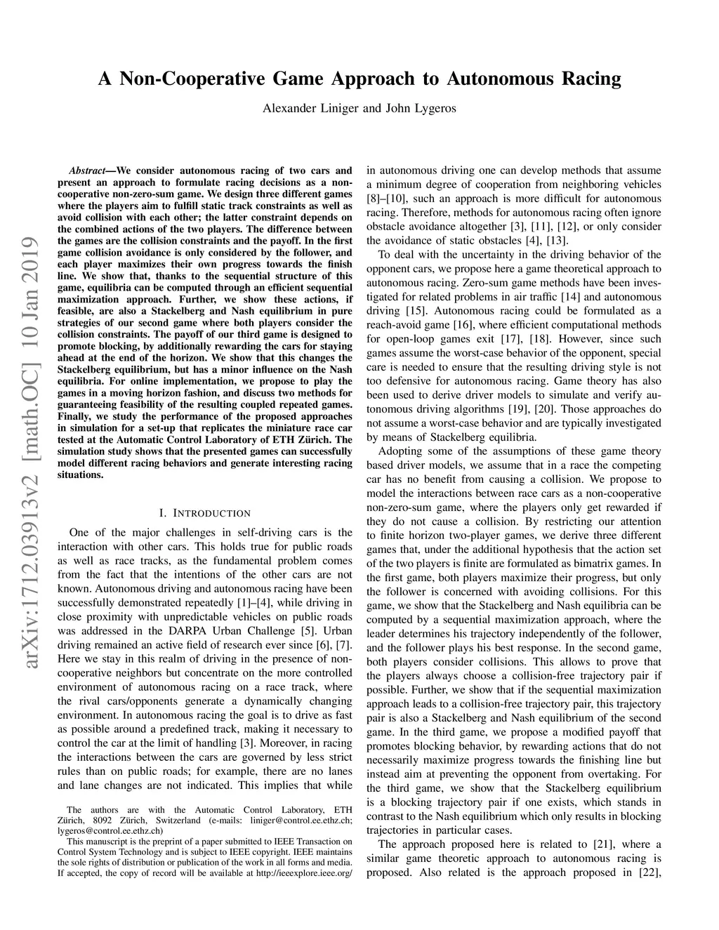 A Non-Cooperative Game Approach to Autonomous Racing