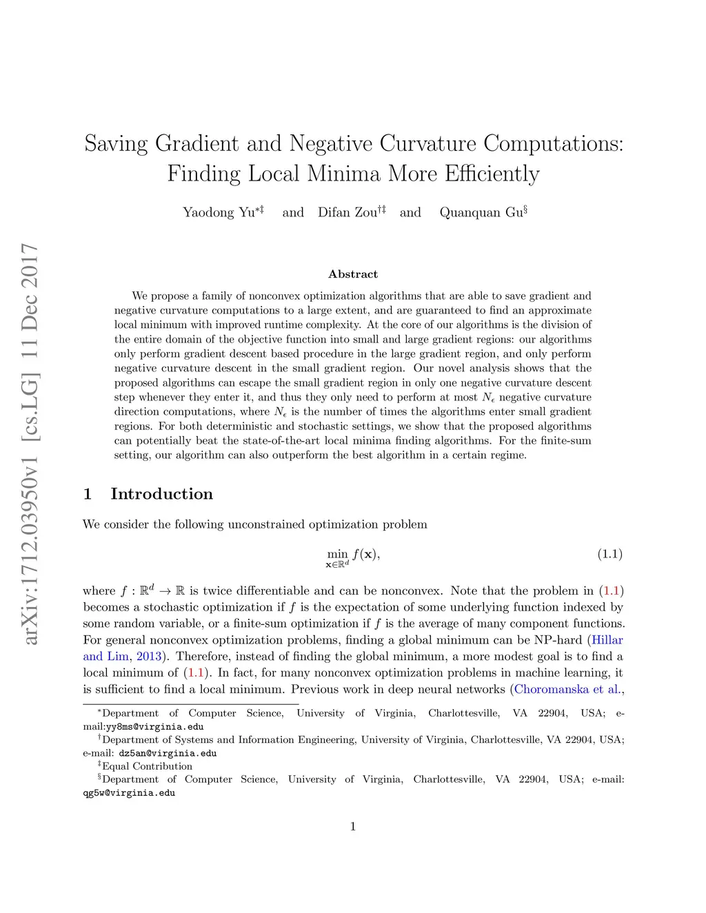 We propose a family of nonconvex optimization algorithms that are able to save gradient and negative curvature computations to a large extent, and are guaranteed to find an approximate local minimum with improved runtime complexity. At the core of our algorithms is the division of the entire domain of the objective function into small and large gradient regions: our algorithms only perform gradient descent based procedure in the large gradient region, and only perform negative curvature descent in the small gradient region. Our novel analysis shows that the proposed algorithms can escape the small gradient region in only one negative curvature descent step whenever they enter it, and thus they only need to perform at most negative curvature direction computations, where is the number of times the algorithms enter small gradient regions. For both deterministic and stochastic settings, we show that the proposed algorithms can potentially beat the state-of-the-art local minima finding algorithms. For the finite-sum setting, our algorithm can also outperform the best algorithm in a certain regime.