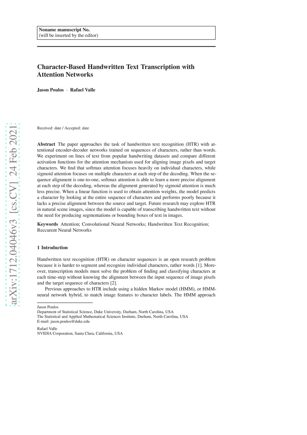 The paper approaches the task of handwritten text recognition (HTR) with attentional encoder-decoder networks trained on sequences of characters, rather than words. We experiment on lines of text from popular handwriting datasets and compare different activation functions for the attention mechanism used for aligning image pixels and target characters. We find that softmax attention focuses heavily on individual characters, while sigmoid attention focuses on multiple characters at each step of the decoding. When the sequence alignment is one-to-one, softmax attention is able to learn a more precise alignment at each step of the decoding, whereas the alignment generated by sigmoid attention is much less precise. When a linear function is used to obtain attention weights, the model predicts a character by looking at the entire sequence of characters and performs poorly because it lacks a precise alignment between the source and target. Future research may explore HTR in natural scene images, since the model is capable of transcribing handwritten text without the need for producing segmentations or bounding boxes of text in images.