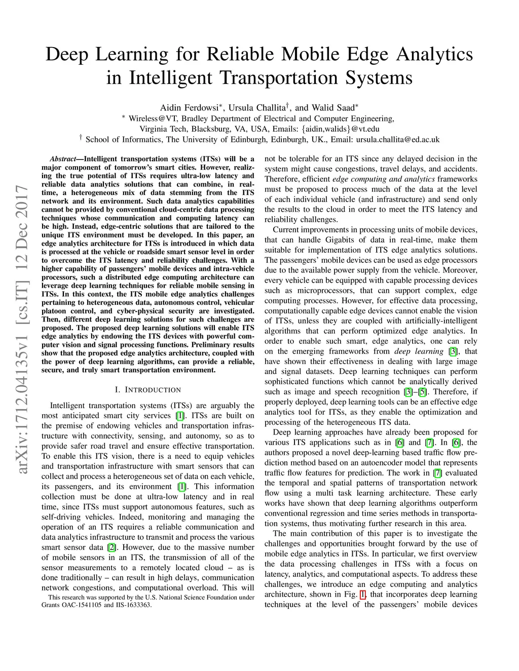 Intelligent transportation systems (ITSs) will be a major component of tomorrow's smart cities. However, realizing the true potential of ITSs requires ultra-low latency and reliable data analytics solutions that can combine, in real-time, a heterogeneous mix of data stemming from the ITS network and its environment. Such data analytics capabilities cannot be provided by conventional cloud-centric data processing techniques whose communication and computing latency can be high. Instead, edge-centric solutions that are tailored to the unique ITS environment must be developed. In this paper, an edge analytics architecture for ITSs is introduced in which data is processed at the vehicle or roadside smart sensor level in order to overcome the ITS latency and reliability challenges. With a higher capability of passengers' mobile devices and intra-vehicle processors, such a distributed edge computing architecture can leverage deep learning techniques for reliable mobile sensing in ITSs. In this context, the ITS mobile edge analytics challenges pertaining to heterogeneous data, autonomous control, vehicular platoon control, and cyber-physical security are investigated. Then, different deep learning solutions for such challenges are proposed. The proposed deep learning solutions will enable ITS edge analytics by endowing the ITS devices with powerful computer vision and signal processing functions. Preliminary results show that the proposed edge analytics architecture, coupled with the power of deep learning algorithms, can provide a reliable, secure, and truly smart transportation environment.