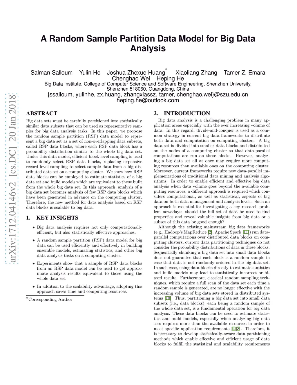 Big data sets must be carefully partitioned into statistically similar data subsets that can be used as representative samples for big data analysis tasks. In this paper, we propose the random sample partition (RSP) data model to represent a big data set as a set of non-overlapping data subsets, called RSP data blocks, where each RSP data block has a probability distribution similar to the whole big data set. Under this data model, efficient block level sampling is used to randomly select RSP data blocks, replacing expensive record level sampling to select sample data from a big distributed data set on a computing cluster. We show how RSP data blocks can be employed to estimate statistics of a big data set and build models which are equivalent to those built from the whole big data set. In this approach, analysis of a big data set becomes analysis of few RSP data blocks which have been generated in advance on the computing cluster. Therefore, the new method for data analysis based on RSP data blocks is scalable to big data.