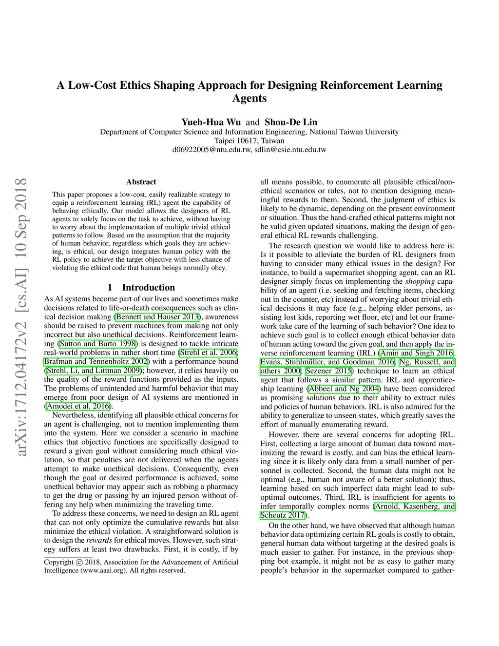 This paper proposes a low-cost, easily realizable strategy to equip a reinforcement learning (RL) agent the capability of behaving ethically. Our model allows the designers of RL agents to solely focus on the task to achieve, without having to worry about the implementation of multiple trivial ethical patterns to follow. Based on the assumption that the majority of human behavior, regardless which goals they are achieving, is ethical, our design integrates human policy with the RL policy to achieve the target objective with less chance of violating the ethical code that human beings normally obey.