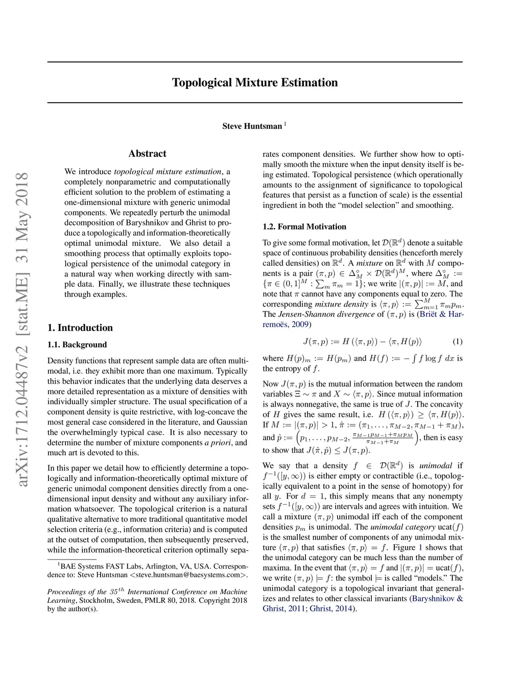 Density functions that represent sample data are often multimodal, i.e. they exhibit more than one maximum. Typically this behavior is taken to indicate that the underlying data deserves a more detailed representation as a mixture of densities with individually simpler structure. The usual specification of a component density is quite restrictive, with log-concave the most general case considered in the literature, and Gaussian the overwhelmingly typical case. It is also necessary to determine the number of mixture components \emph{a priori}, and much art is devoted to this. Here, we introduce \emph{topological mixture estimation}, a completely nonparametric and computationally efficient solution to the one-dimensional problem where mixture components need only be unimodal. We repeatedly perturb the unimodal decomposition of Baryshnikov and Ghrist to produce a topologically and information-theoretically optimal unimodal mixture. We also detail a smoothing process that optimally exploits topological persistence of the unimodal category in a natural way when working directly with sample data. Finally, we illustrate these techniques through examples.