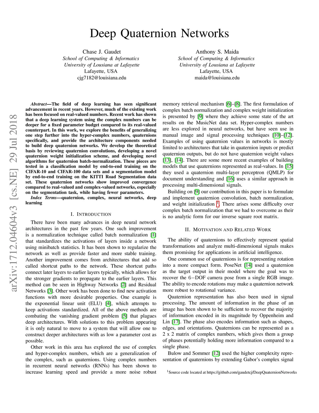 The field of deep learning has seen significant advancement in recent years. However, much of the existing work has been focused on real-valued numbers. Recent work has shown that a deep learning system using the complex numbers can be deeper for a fixed parameter budget compared to its real-valued counterpart. In this work, we explore the benefits of generalizing one step further into the hyper-complex numbers, quaternions specifically, and provide the architecture components needed to build deep quaternion networks. We develop the theoretical basis by reviewing quaternion convolutions, developing a novel quaternion weight initialization scheme, and developing novel algorithms for quaternion batch-normalization. These pieces are tested in a classification model by end-to-end training on the CIFAR-10 and CIFAR-100 data sets and a segmentation model by end-to-end training on the KITTI Road Segmentation data set. These quaternion networks show improved convergence compared to real-valued and complex-valued networks, especially on the segmentation task, while having fewer parameters