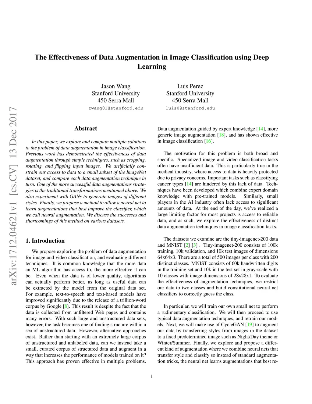 In this paper, we explore and compare multiple solutions to the problem of data augmentation in image classification. Previous work has demonstrated the effectiveness of data augmentation through simple techniques, such as cropping, rotating, and flipping input images. We artificially constrain our access to data to a small subset of the ImageNet dataset, and compare each data augmentation technique in turn. One of the more successful data augmentations strategies is the traditional transformations mentioned above. We also experiment with GANs to generate images of different styles. Finally, we propose a method to allow a neural net to learn augmentations that best improve the classifier, which we call neural augmentation. We discuss the successes and shortcomings of this method on various datasets.
