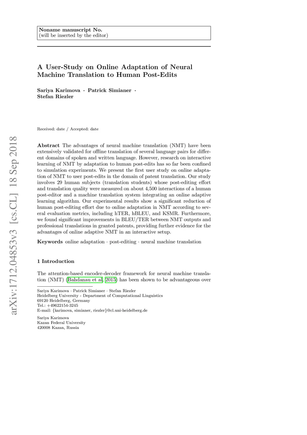 The advantages of neural machine translation (NMT) have been extensively validated for offline translation of several language pairs for different domains of spoken and written language. However, research on interactive learning of NMT by adaptation to human post-edits has so far been confined to simulation experiments. We present the first user study on online adaptation of NMT to user post-edits in the domain of patent translation. Our study involves 29 human subjects (translation students) whose post-editing effort and translation quality were measured on about 4,500 interactions of a human post-editor and a machine translation system integrating an online adaptive learning algorithm. Our experimental results show a significant reduction of human post-editing effort due to online adaptation in NMT according to several evaluation metrics, including hTER, hBLEU, and KSMR. Furthermore, we found significant improvements in BLEU/TER between NMT outputs and professional translations in granted patents, providing further evidence for the advantages of online adaptive NMT in an interactive setup.