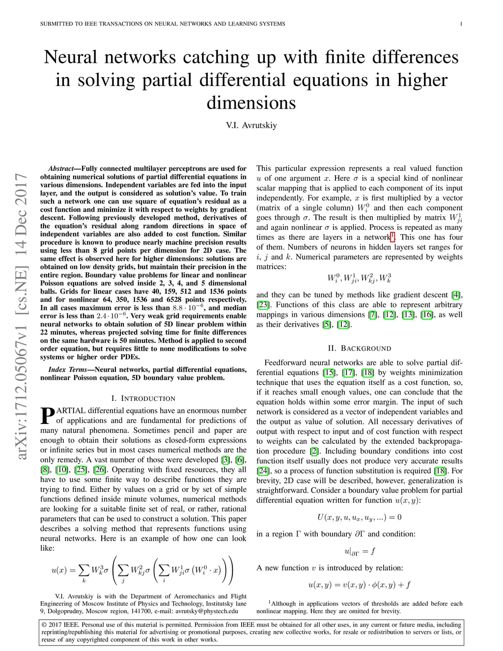 Fully connected multilayer perceptrons are used for obtaining numerical solutions of partial differential equations in various dimensions. Independent variables are fed into the input layer, and the output is considered as solution's value. To train such a network one can use square of equation's residual as a cost function and minimize it with respect to weights by gradient descent. Following previously developed method, derivatives of the equation's residual along random directions in space of independent variables are also added to cost function. Similar procedure is known to produce nearly machine precision results using less than 8 grid points per dimension for 2D case. The same effect is observed here for higher dimensions: solutions are obtained on low density grids, but maintain their precision in the entire region. Boundary value problems for linear and nonlinear Poisson equations are solved inside 2, 3, 4, and 5 dimensional balls. Grids for linear cases have 40, 159, 512 and 1536 points and for nonlinear 64, 350, 1536 and 6528 points respectively. In all cases maximum error is less than , and median error is less than . Very weak grid requirements enable neural networks to obtain solution of 5D linear problem within 22 minutes, whereas projected solving time for finite differences on the same hardware is 50 minutes. Method is applied to second order equation, but requires little to none modifications to solve systems or higher order PDEs.
