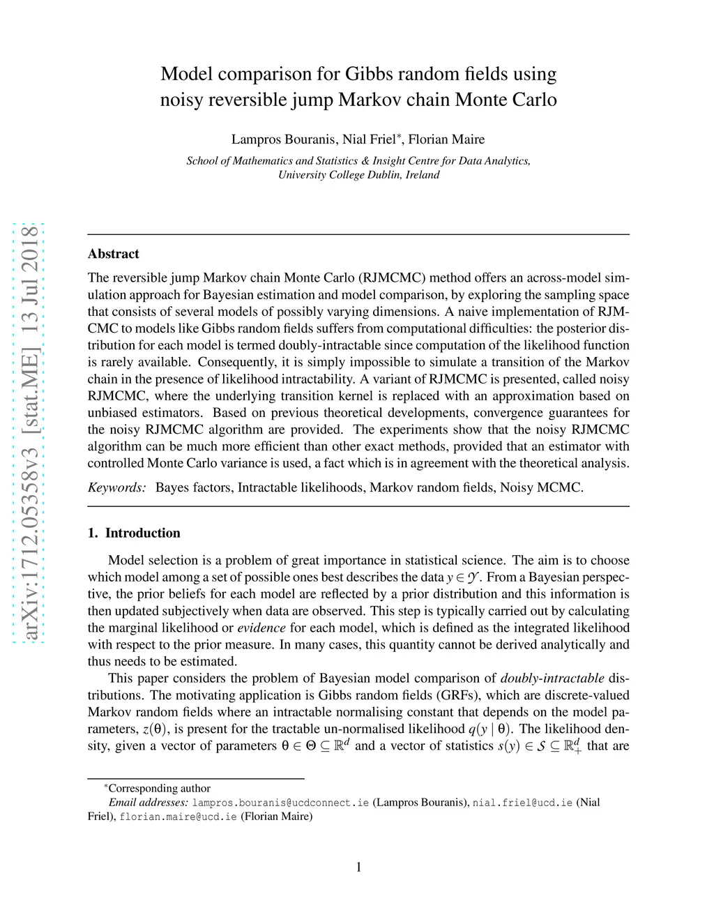 The reversible jump Markov chain Monte Carlo (RJMCMC) method offers an across-model simulation approach for Bayesian estimation and model comparison, by exploring the sampling space that consists of several models of possibly varying dimensions. A naive implementation of RJMCMC to models like Gibbs random fields suffers from computational difficulties: the posterior distribution for each model is termed doubly-intractable since computation of the likelihood function is rarely available. Consequently, it is simply impossible to simulate a transition of the Markov chain in the presence of likelihood intractability. A variant of RJMCMC is presented, called noisy RJMCMC, where the underlying transition kernel is replaced with an approximation based on unbiased estimators. Based on previous theoretical developments, convergence guarantees for the noisy RJMCMC algorithm are provided. The experiments show that the noisy RJMCMC algorithm can be much more efficient than other exact methods, provided that an estimator with controlled Monte Carlo variance is used, a fact which is in agreement with the theoretical analysis.