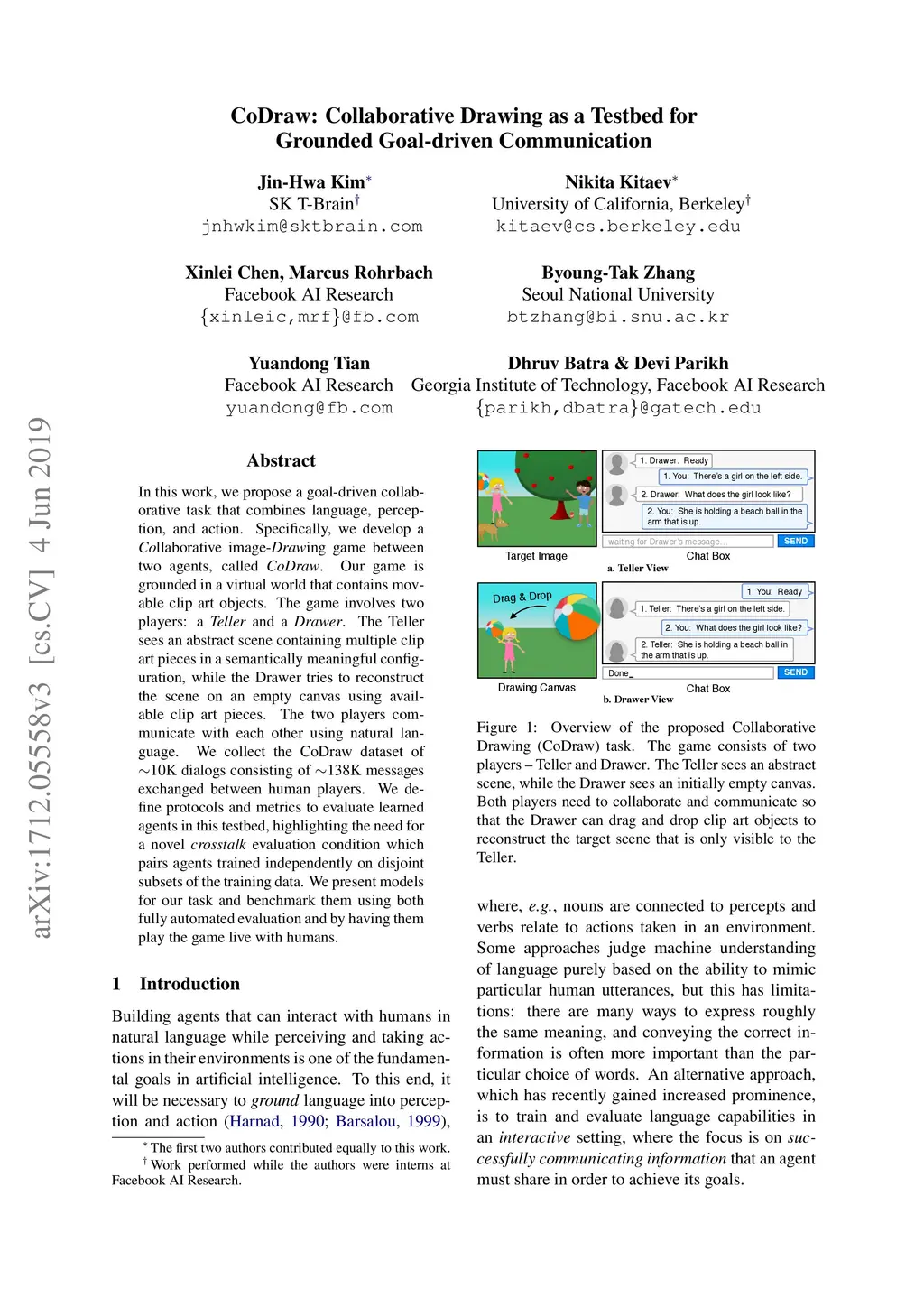 CoDraw: Collaborative Drawing as a Testbed for Grounded Goal-driven