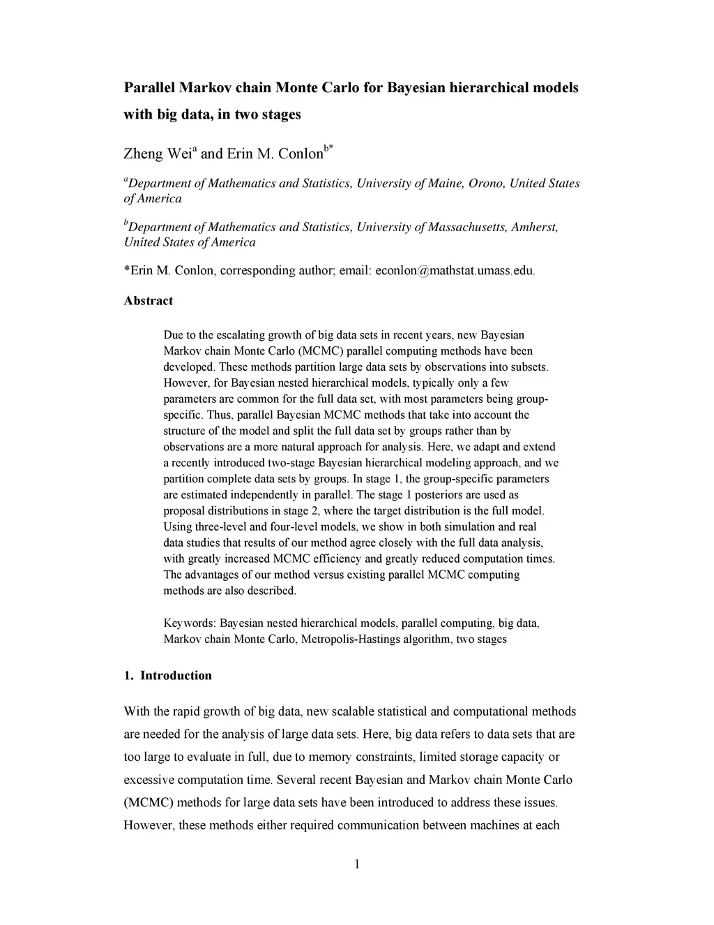 Due to the escalating growth of big data sets in recent years, new Bayesian Markov chain Monte Carlo (MCMC) parallel computing methods have been developed. These methods partition large data sets by observations into subsets. However, for Bayesian nested hierarchical models, typically only a few parameters are common for the full data set, with most parameters being group-specific. Thus, parallel Bayesian MCMC methods that take into account the structure of the model and split the full data set by groups rather than by observations are a more natural approach for analysis. Here, we adapt and extend a recently introduced two-stage Bayesian hierarchical modeling approach, and we partition complete data sets by groups. In stage 1, the group-specific parameters are estimated independently in parallel. The stage 1 posteriors are used as proposal distributions in stage 2, where the target distribution is the full model. Using three-level and four-level models, we show in both simulation and real data studies that results of our method agree closely with the full data analysis, with greatly increased MCMC efficiency and greatly reduced computation times. The advantages of our method versus existing parallel MCMC computing methods are also described.