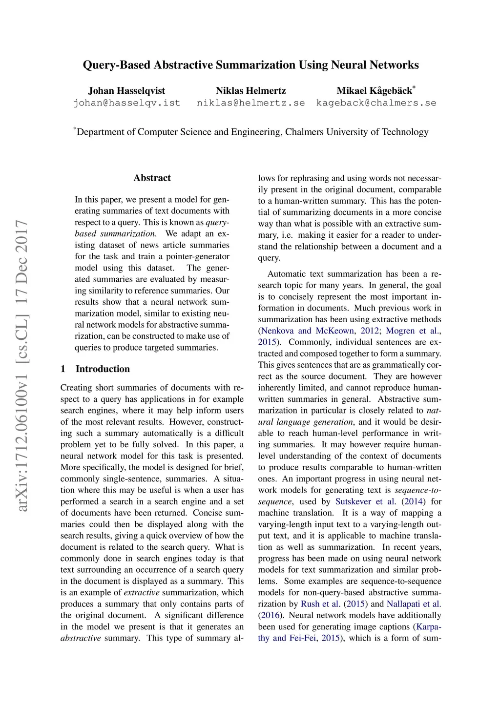 In this paper, we present a model for generating summaries of text documents with respect to a query. This is known as query-based summarization. We adapt an existing dataset of news article summaries for the task and train a pointer-generator model using this dataset. The generated summaries are evaluated by measuring similarity to reference summaries. Our results show that a neural network summarization model, similar to existing neural network models for abstractive summarization, can be constructed to make use of queries to produce targeted summaries.