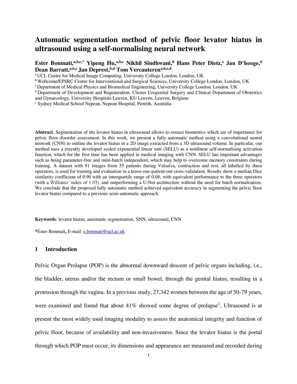 Segmentation of the levator hiatus in ultrasound allows to extract biometrics which are of importance for pelvic floor disorder assessment. In this work, we present a fully automatic method using a convolutional neural network (CNN) to outline the levator hiatus in a 2D image extracted from a 3D ultrasound volume. In particular, our method uses a recently developed scaled exponential linear unit (SELU) as a nonlinear self-normalising activation function, which for the first time has been applied in medical imaging with CNN. SELU has important advantages such as being parameter-free and mini-batch independent, which may help to overcome memory constraints during training. A dataset with 91 images from 35 patients during Valsalva, contraction and rest, all labelled by three operators, is used for training and evaluation in a leave-one-patient-out cross-validation. Results show a median Dice similarity coefficient of 0.90 with an interquartile range of 0.08, with equivalent performance to the three operators (with a Williams' index of 1.03), and outperforming a U-Net architecture without the need for batch normalisation. We conclude that the proposed fully automatic method achieved equivalent accuracy in segmenting the pelvic floor levator hiatus compared to a previous semi-automatic approach.